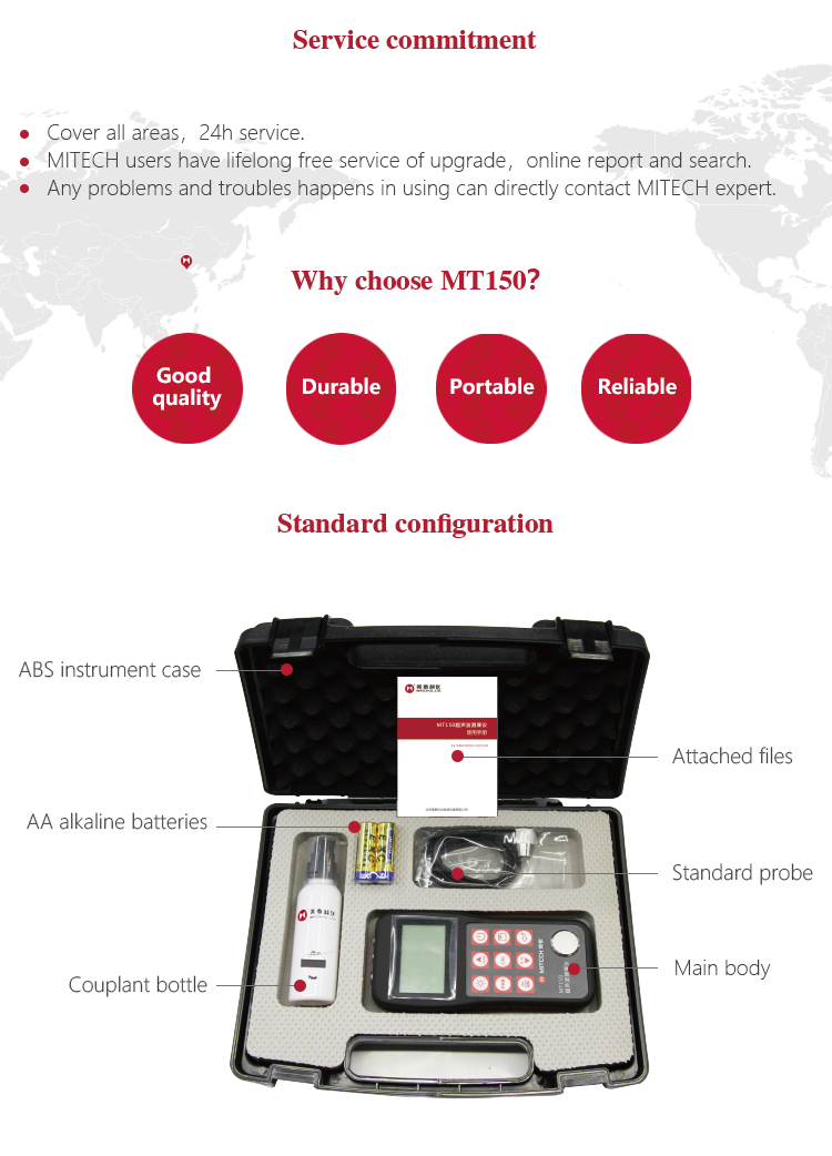 The instrument case of Mitech ultrasonic thickness gauge, length: 27cm, width: 22.5cm, height: 7.5cm and weight: 0.698kg, designed with ABS engineering plastic, It has excellent performance like waterproof, shockproof, excellent heat resistance and low temperature resistance. It can effectively prevent oil, dust and corrosion in harsh environment. Its size in line with the standards for aviation and train carrying (capable of putting under the seat and on the luggage rack), it is safe, reliable and stable.
