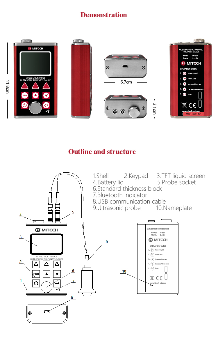 Product OverviewMT660 multi-mode ultrasonic thickness gauge is the newest promoted upgraded product by Mitech. It pays more attention to user experience and functional innovation. Adopted with 320*240 colorful LCD display, it can show you clear measurement result under dim light and strong sunshine environment, improved the visual experience greatly. Sealed aluminum-magnesium alloy case delicate design, smaller volume, better quality are specially designed for defense against oil, dust in the bad sit environment. With intelligent warning function, it will promote automatically when beyond the setting range, it is convenient for reading. It can meet the efficient collecting material’s multiple points’ thickness accurate testing demand. It supports 0.001 high accuracy display and Bluetooth communication. With through coating mode and common mode, its unique performance of capable for testing thickness through the coating provides efficient solution for testing the workpiece of coated surface or corrosion materials. It can measure the workpiece directly without needing to get rid of the surface coating before measurement. It’s widely used for monitoring the production equipments’ various pipelines and pressure vessel corrosion reducing degree in the fields of petroleum, chemical, metallurgy, shipbuilding, aviation, aerospace and so on. It also can be used for making accurate measurement to various plates and machining parts. It is the necessary professional precision instrument for improving the production efficiency and qualification rate as well as saving cost.