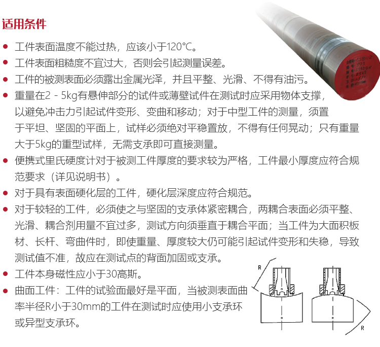 只有重大于5kg的重型試樣,無(wú)需支承即可直接測(cè)量。便攜式里氏硬度計(jì)對(duì)于被測(cè)工件 厚度的要求較為嚴(yán)格,工件最小厚度應(yīng)符合說明書規(guī)范要求。
