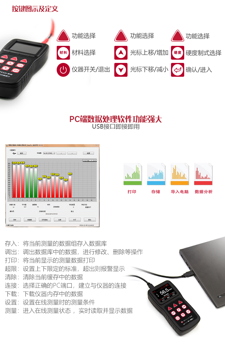 設(shè)有USB接口,通過PC端數(shù)據(jù)處理軟件,可傳輸測(cè)量結(jié)果、測(cè)值存儲(chǔ)管理、測(cè)值統(tǒng)計(jì)分析、打印測(cè)值報(bào)告、批量設(shè)定儀器參數(shù)等,滿足質(zhì)量保證和管理的更高需求