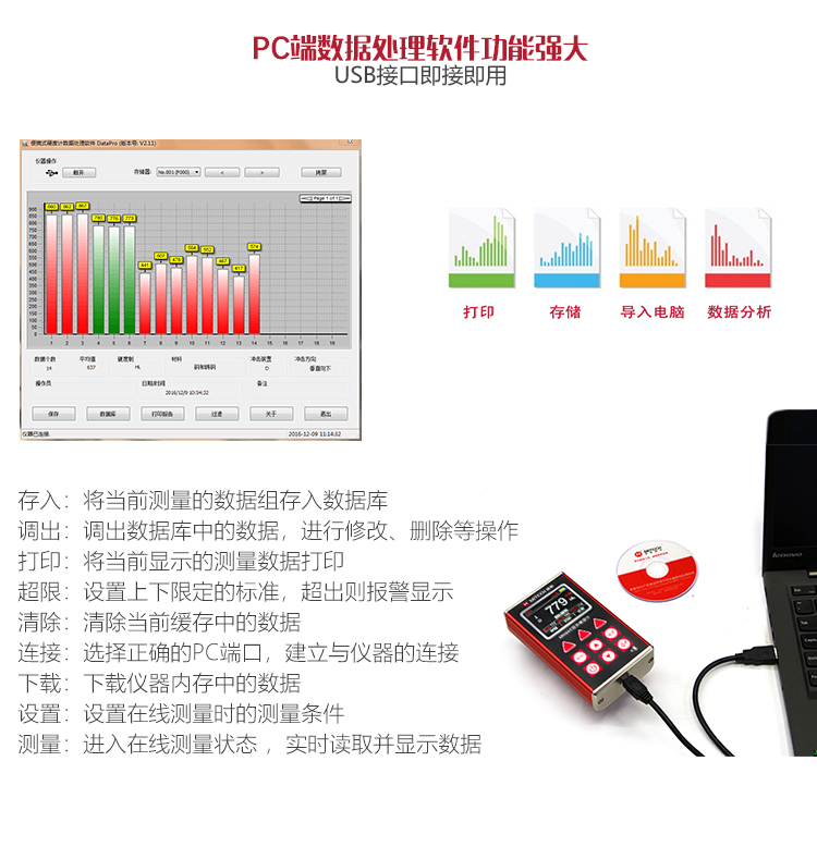 配備PC端數(shù)據(jù)處理軟件,具有傳輸測量結(jié)果、存儲(chǔ)管理、統(tǒng)計(jì)分析、生成測量報(bào)告等豐富功能。