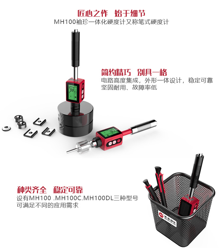 產(chǎn)品概述MH100系列袖珍硬度計又稱筆式硬度計,基于里氏硬度測量原理,可方便快捷地現(xiàn)場檢測多種金屬材料的硬度,支持里氏、布氏、洛氏等多種硬度制氏間的自由轉(zhuǎn)換。它一體化精巧設(shè)計,體積小,便于攜帶,集成度高,性能穩(wěn)定可靠,支持數(shù)據(jù)傳輸及打印存儲功能。廣泛地應(yīng)用于金屬加工制造業(yè)、特種設(shè)備、永久性組件的失效分析、商檢等領(lǐng)域。特別適宜對大型零件及不可拆卸部件的現(xiàn)場硬度測試。是提高生產(chǎn)合格率、節(jié)約成本必備的專業(yè)精密儀器。