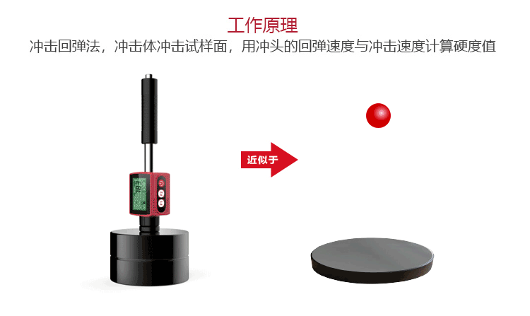 用規(guī)定質(zhì)量的沖擊體在彈力作用下,以一定速度沖擊試樣表面,用沖頭在距試樣表面1mm處的回彈速度與沖擊速度的比值計算硬度值。計算公式如下: