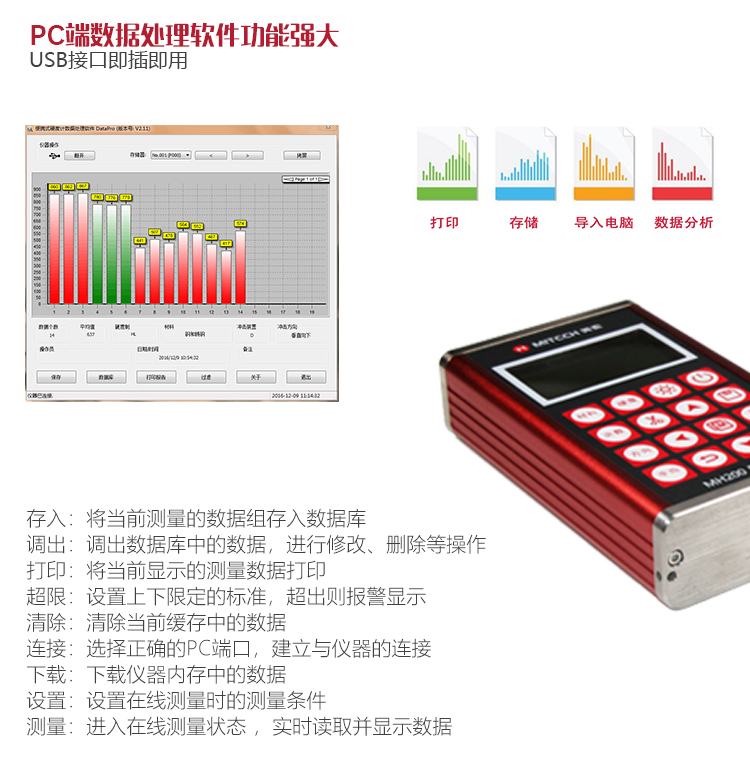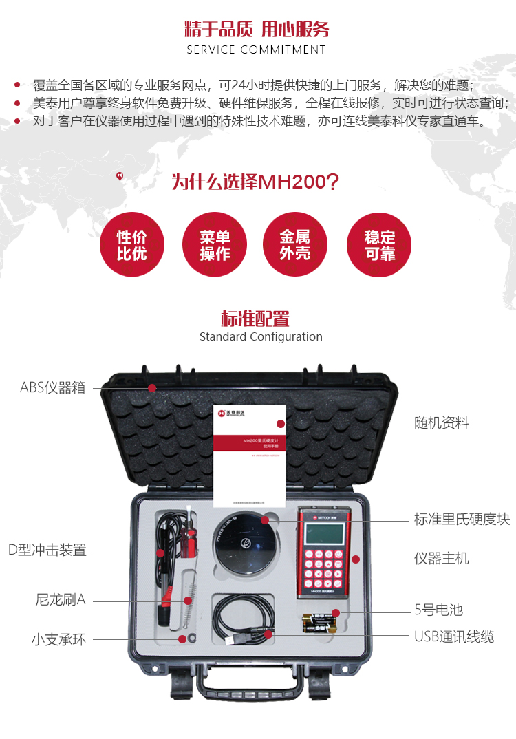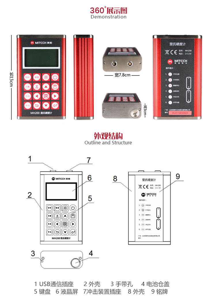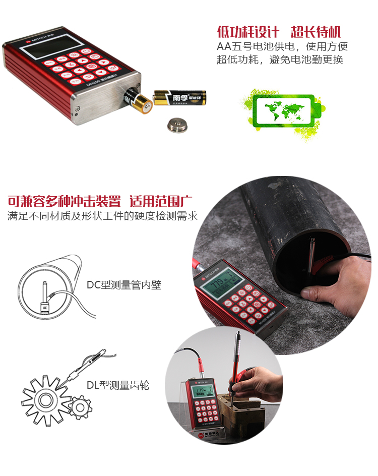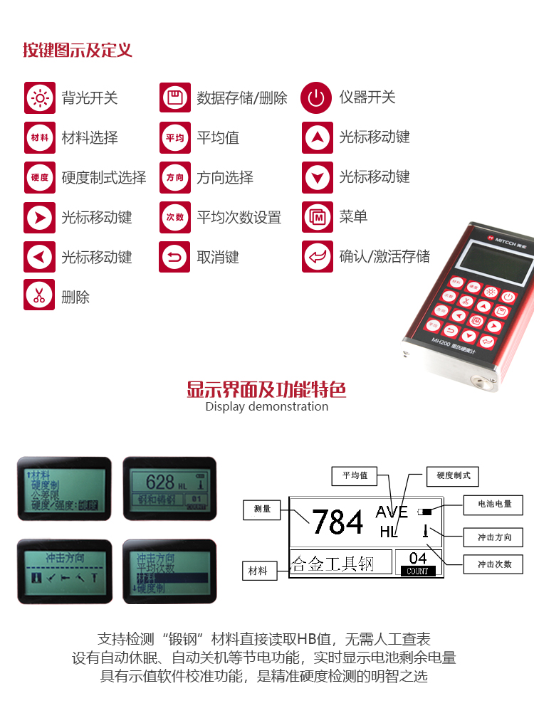 產(chǎn)品概述MH200便攜式里氏硬度計,基于里氏硬度測量原理,可方便快捷地現(xiàn)場檢測多種金屬材料的硬度,支持里氏、布氏、洛氏等多種硬度制氏間的自由轉(zhuǎn)換。它采用國際流行的全封閉鋁美合金外殼,堅固耐用,擁有強大的抗電磁、抗振動、抗干擾能力;低功耗設(shè)計依托穩(wěn)定的IC集成電路,性能可靠;全中文點陣液晶顯示,菜單式操作簡單快捷;支持PC機通訊及打印功能。被廣泛應用于退火、回火、淬火熱處理工件的質(zhì)量控制;機床導軌、汽車底盤的硬度檢測;大型不可拆卸零部件的現(xiàn)場在役硬度測試;五金、鍛造、機床、特種鋼材的質(zhì)量檢測;批量生產(chǎn)過程中產(chǎn)品的質(zhì)量控制等,質(zhì)優(yōu)價廉,實用經(jīng)濟,是硬度檢測常規(guī)需求的明智之選。