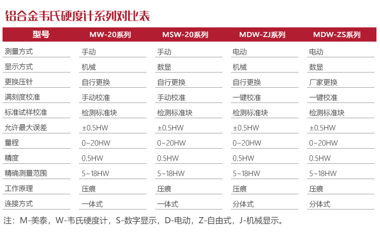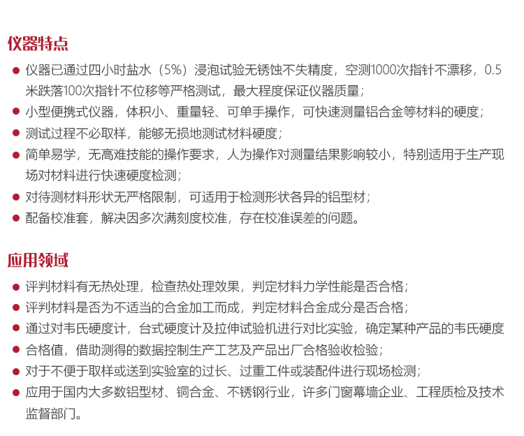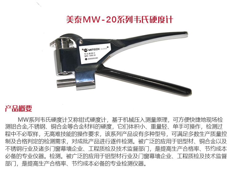 產(chǎn)品概述MW-20系列鋁合金系列韋氏硬度計(jì)又稱鉗式硬度計(jì),基于機(jī)械壓入測量原理,可方便快捷地現(xiàn)場檢測鋁合金材料的硬度。它們體積小、重量輕、單手可操作,檢測過程中不必取樣,無高難技能的操作要求。該系列產(chǎn)品設(shè)有多種型號(hào),可滿足多數(shù)生產(chǎn)質(zhì)量控制及合格判定的檢測需求,對成批產(chǎn)品進(jìn)行逐件檢測。被廣泛的應(yīng)用于鋁型材行業(yè)及諸多門窗幕墻企業(yè)、工程質(zhì)檢及技術(shù)監(jiān)督部門,是提高生產(chǎn)合格率、節(jié)約成本必備的專業(yè)儀器。