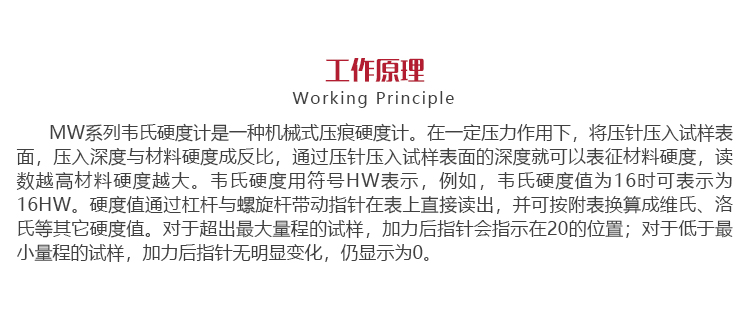 工作原理MW-20系列鋁合金系列韋氏硬度計(jì)是一種機(jī)械式壓痕硬度計(jì)。在一定壓力作用下,將壓針壓入試樣表面,壓針壓入試樣表面的深度與材料硬度成反比,通過杠桿與螺旋桿帶動(dòng)指針將壓入深度轉(zhuǎn)換為材料硬度值并在表盤上顯示出測量結(jié)果。韋氏硬度用符號(hào)HW表示,例如,韋氏硬度值為16時(shí)可表示為16HW。測得的韋氏硬度值可依據(jù)附表換算成維氏、洛氏等其它硬度值。對于超出最大量程的試樣,加力后指針會(huì)指示在表盤滿刻度值20的位置;對于低于最小量程的試樣,加力后指針無明顯變化,仍顯示為0。