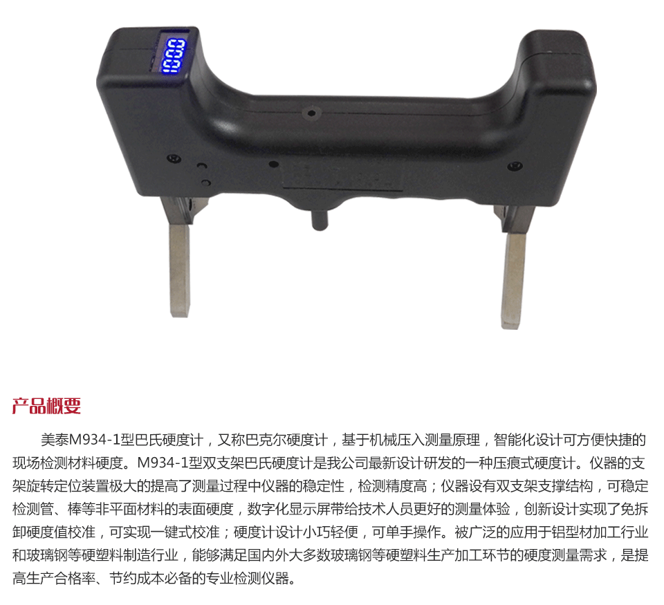 美泰M934-1型巴氏硬度計,又稱巴克爾硬度計,基于機械壓入測量原理,智能化設(shè)計可方便快捷的現(xiàn)場檢測材料硬度。M934-1型雙支架巴氏硬度計是我公司最新設(shè)計研發(fā)的一種壓痕式硬度計。儀器的支架旋轉(zhuǎn)定位裝置極大的提高了測量過程中儀器的穩(wěn)定性,檢測精度高;儀器設(shè)有雙支架支撐結(jié)構(gòu),可穩(wěn)定檢測管、棒等非平面材料的表面硬度,數(shù)字化顯示屏帶給技術(shù)人員更好的測量體驗,創(chuàng)新設(shè)計實現(xiàn)了免拆卸硬度值校準(zhǔn),可實現(xiàn)一鍵式校準(zhǔn);硬度計設(shè)計小巧輕便,可單手操作。被廣泛的應(yīng)用于鋁型材加工行業(yè)和玻璃鋼等硬塑料制造行業(yè),能夠滿足國內(nèi)外大多數(shù)玻璃鋼等硬塑料生產(chǎn)加工環(huán)節(jié)的硬度測量需求,是提高生產(chǎn)合格率、節(jié)約成本必備的專業(yè)檢測儀器。