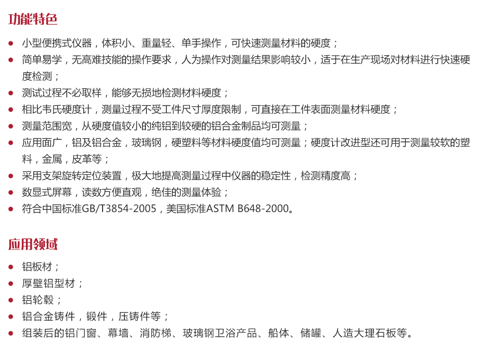 應(yīng)用面廣,鋁及鋁合金,玻璃鋼,硬塑料等材料硬度值均可測量;硬度計改進型還可用于測量較軟的塑料,金屬,皮革等;
