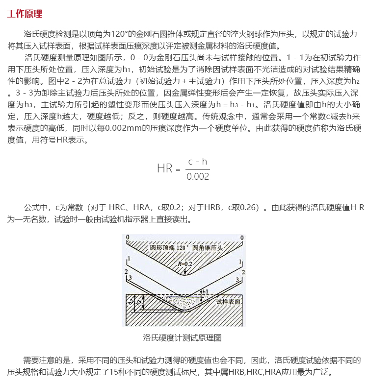 工作原理洛氏硬度檢測是以頂角為120°的金剛石圓錐體或規(guī)定直徑的淬火鋼球作為壓頭,以規(guī)定的試驗(yàn)力將其壓入試樣表面,根據(jù)試樣表面壓痕深度以評定被測金屬材料的洛氏硬度值。