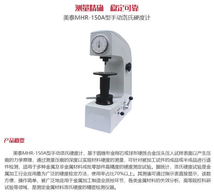產(chǎn)品概述美泰MHR-150A型手動洛氏硬度計,基于圓錐形金剛石或球形硬質(zhì)合金壓頭壓入試樣表面以產(chǎn)生壓痕的力學(xué)原理,通過測量壓痕的深度以實(shí)現(xiàn)材料硬度的測量,可針對被加工試件的成品或半成品進(jìn)行逐件檢測,適用于多種金屬及非金屬材料成批零部件高精度的硬度測定試驗(yàn)。據(jù)統(tǒng)計,洛氏硬度試驗(yàn)是金屬加工行業(yè)應(yīng)用最為廣泛的硬度檢定方法,使用率占比70%以上。其測值可通過指示表直接顯示,讀數(shù)方便,操作簡單,被廣泛地應(yīng)用于金屬加工制造業(yè)質(zhì)控環(huán)節(jié)、各類金屬材料的失效分析、高等院??蒲?/span>試驗(yàn)等領(lǐng)域,是測定金屬材料洛氏硬度的精密檢測儀器。