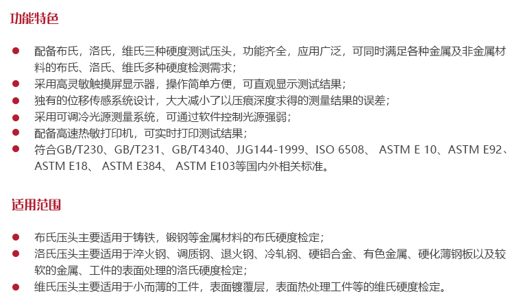 儀器特點?配備布氏,洛氏,維氏三種硬度測試壓頭,功能齊全,應(yīng)用廣泛,可同時滿足各種金屬及非金屬材料的布氏、洛氏、維氏多種硬度檢測需求;