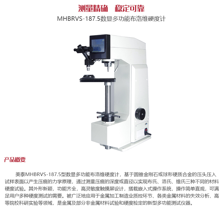 美泰MHBRVS-187.5型數(shù)顯多功能布洛維硬度計,基于圓錐金剛石或球形硬質(zhì)合金的壓頭壓入試樣表面以產(chǎn)生壓痕的力學(xué)原理,通過測量壓痕的深度或直徑以實現(xiàn)布氏、洛氏、維氏三種不同的材料硬度試驗。其外形新穎,功能齊全,高靈敏度觸摸屏設(shè)計,搭載嵌入式操作系統(tǒng),操作簡單直觀,可滿足用戶多種硬度測試的需要。被廣泛地應(yīng)用于金屬加工制造業(yè)質(zhì)控環(huán)節(jié)、各類金屬材料的失效分析、高等院??蒲袑嶒灥阮I(lǐng)域,是金屬及部分非金屬材料研究和硬度檢定的新型多功能測試儀器。