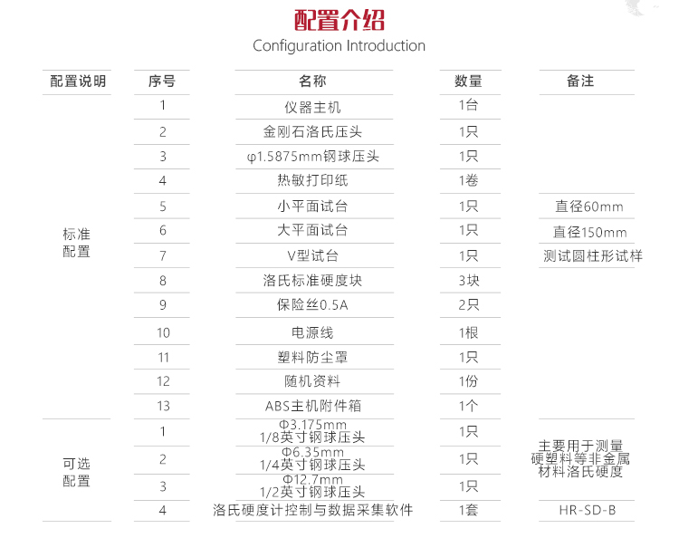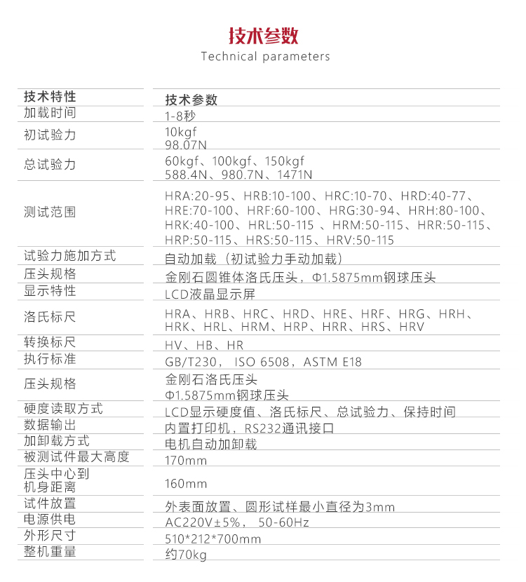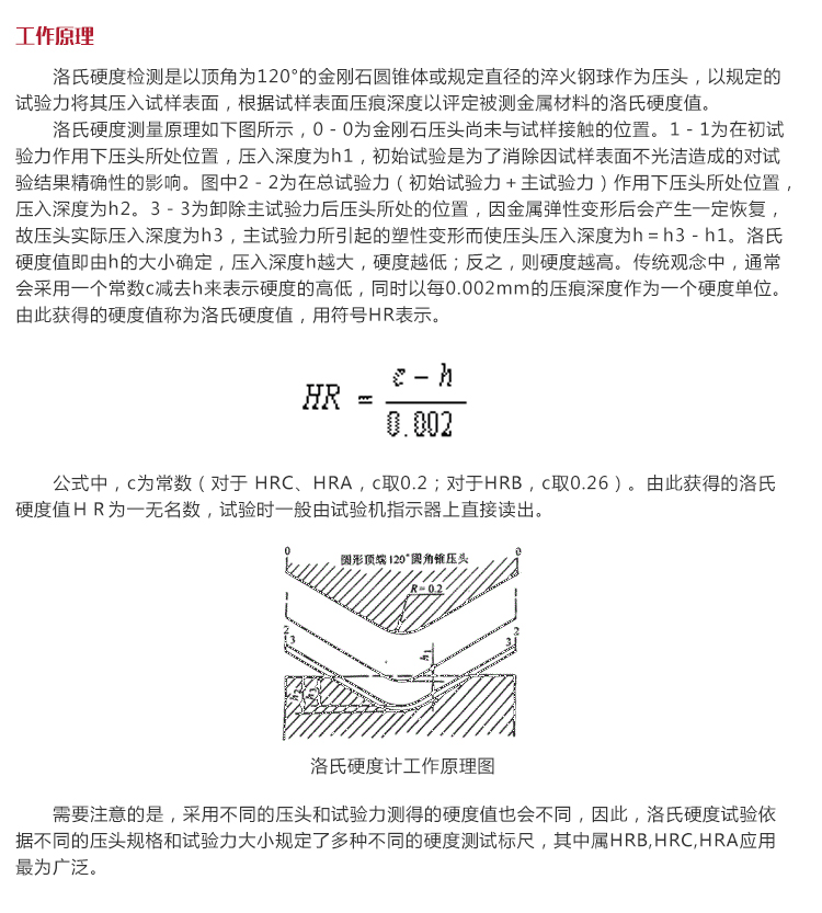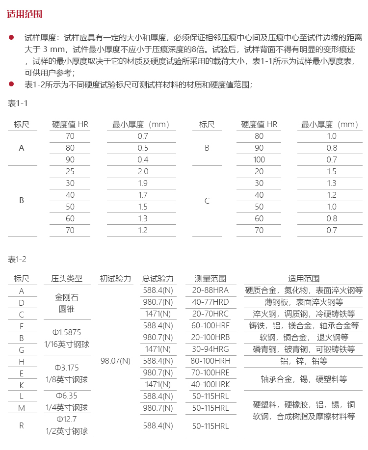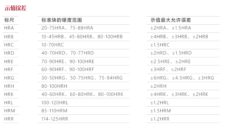 測試范圍 HRA:20-95、HRB:10-100、HRC:10-70、HRD:40-77、HRE:70-100、HRF:60-100、HRG:30-94、HRH:80-100、HRK:40-100、HRL:5