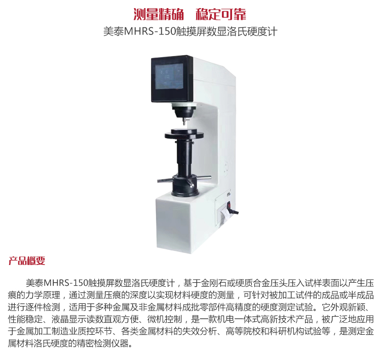 美泰MHRS-150觸摸屏數(shù)顯洛氏硬度計,基于金剛石或硬質(zhì)合金壓頭壓入試樣表面以產(chǎn)生壓痕的力學原理,通過測量壓痕的深度以實現(xiàn)材料硬度的測量,可針對被加工試件的成品或半成品進行逐件檢測,適用于多種金屬及非金屬材料成批零部件高精度的硬度測定試驗。外觀新穎、性能穩(wěn)定、液晶顯示讀數(shù)直觀方便、微機控制,是一款機電一體式高新技術產(chǎn)品,被廣泛地應用于金屬加工制造業(yè)質(zhì)控環(huán)節(jié)、各類金屬材料的失效分析、高等院校和科研機構(gòu)試驗等,是測定金屬材料洛氏硬度的精密檢測儀器
