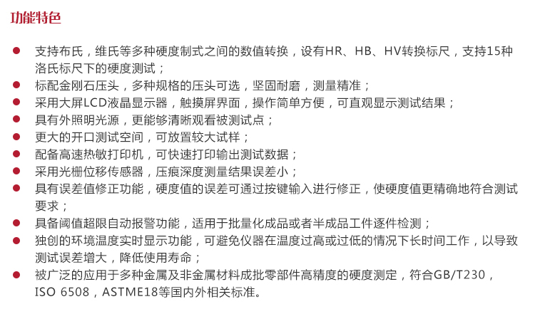 被廣泛的應用于多種金屬及非金屬材料成批零部件高精度的硬度測定,符合GB/T230,ISO 6508ASTME18等國內(nèi)外相關標準。