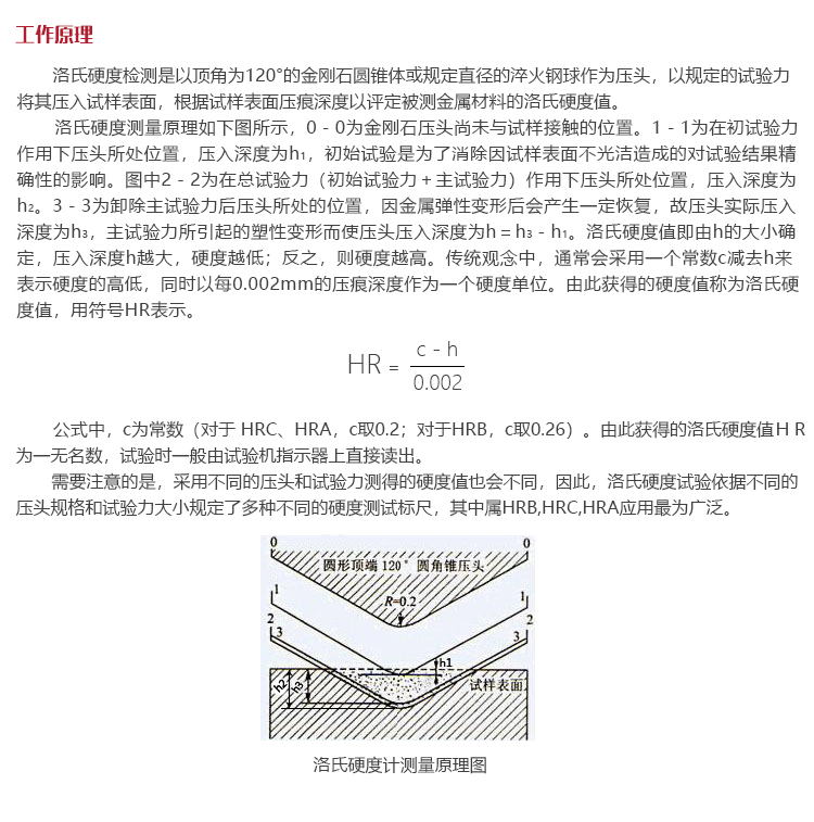 公式中,c為常數(shù)(對(duì)于 HRC、HRA,c取0.2;對(duì)于HRB,c取0.26)。由此獲得的洛氏硬度值HR為一無名數(shù),試驗(yàn)時(shí)一般由試驗(yàn)機(jī)指示器上直接讀出。