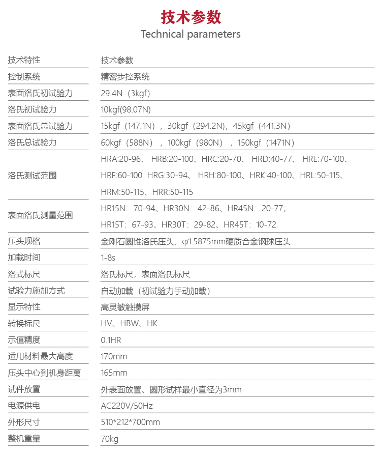 | 表面洛氏測(cè)量范圍 | HR15N:70-94、HR30N:42-86、HR45N:20-77;HR15T:67-93、HR30T:29-82、HR45T:10-72 |