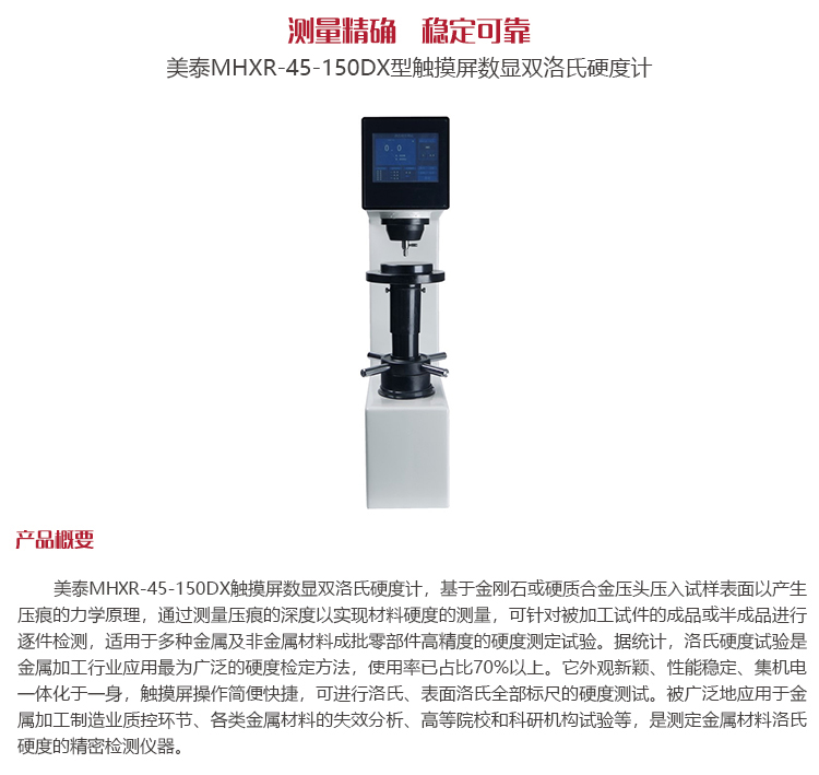 美泰MHXR-45-150DX觸摸屏數(shù)顯雙洛氏硬度計(jì),基于金剛石或硬質(zhì)合金壓頭壓入試樣表面以產(chǎn)生壓痕的力學(xué)原理,通過測(cè)量壓痕的深度以實(shí)現(xiàn)材料硬度的測(cè)量,可針對(duì)被加工試件的成品或半成品進(jìn)行逐件檢測(cè),適用于多種金屬及非金屬材料成批零部件高精度的硬度測(cè)定試驗(yàn)。據(jù)統(tǒng)計(jì),洛氏硬度試驗(yàn)是金屬加工行業(yè)應(yīng)用最為廣泛的硬度檢定方法,使用率已占比70%以上。它外觀新穎、性能穩(wěn)定、集機(jī)電一體化于一身,觸摸屏操作簡(jiǎn)便快捷,可進(jìn)行洛氏、表面洛氏全部標(biāo)尺的硬度測(cè)試。被廣泛地應(yīng)用于金屬加工制造業(yè)質(zhì)控環(huán)節(jié)、各類金屬材料的失效分析、高等院校和科研機(jī)構(gòu)試驗(yàn)等,是測(cè)定金屬材料洛氏硬度的精密檢測(cè)儀器。