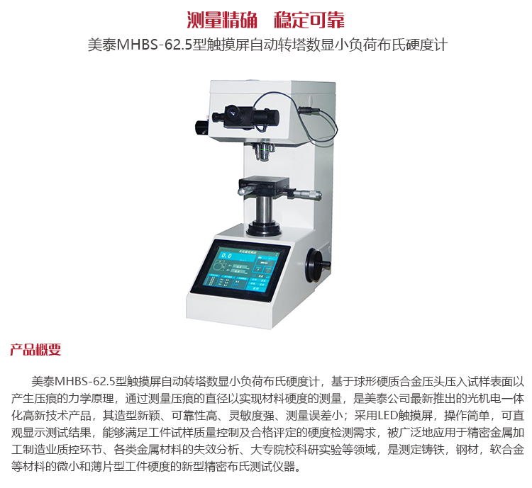 美泰MHBS-62.5型觸摸屏自動轉(zhuǎn)塔數(shù)顯小負(fù)荷布氏硬度計(jì),基于球形硬質(zhì)合金壓頭壓入試樣表面以產(chǎn)生壓痕的力學(xué)原理,通過測量壓痕的直徑以實(shí)現(xiàn)材料硬度的測量,是美泰公司最新推出的光機(jī)電一體化高新技術(shù)產(chǎn)品,其造型新穎、可靠性高、靈敏度強(qiáng)、測量誤差?。徊捎肔ED觸摸屏,操作簡單,可直觀顯示測試結(jié)果,能夠滿足工件試樣質(zhì)量控制及合格評定的硬度檢測需求,被廣泛地應(yīng)用于精密金屬加工制造業(yè)質(zhì)控環(huán)節(jié)、各類金屬材料的失效分析、大專院??蒲袑?shí)驗(yàn)等領(lǐng)域,是測定鑄鐵,鋼材,軟合金等材料的微小和薄片型工件硬度的新型精密布氏測試儀器。