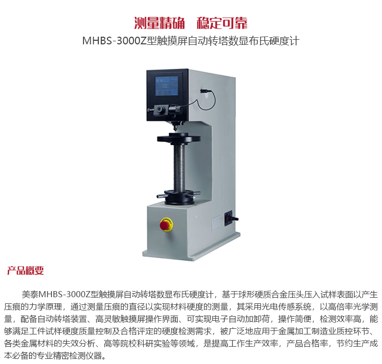 美泰MHBS-3000Z型觸摸屏自動轉塔數顯布氏硬度計,基于球形硬質合金壓頭壓入試樣表面以產生壓痕的力學原理,通過測量壓痕的直徑以實現材料硬度的測量,其采用光電傳感系統(tǒng),以高倍率光學測量,配備自動轉塔裝置、高靈敏觸摸屏操作界面、可實現電子自動加卸荷,操作簡便,檢測效率高,能夠滿足工件試樣硬度質量控制及合格評定的硬度檢測需求,被廣泛地應用于金屬加工制造業(yè)質控環(huán)節(jié)、各類金屬材料的失效分析、高等院??蒲袑嶒灥阮I域,是提高工作生產效率,產品合格率,節(jié)約生產成本必備的專業(yè)精密檢測儀器。
