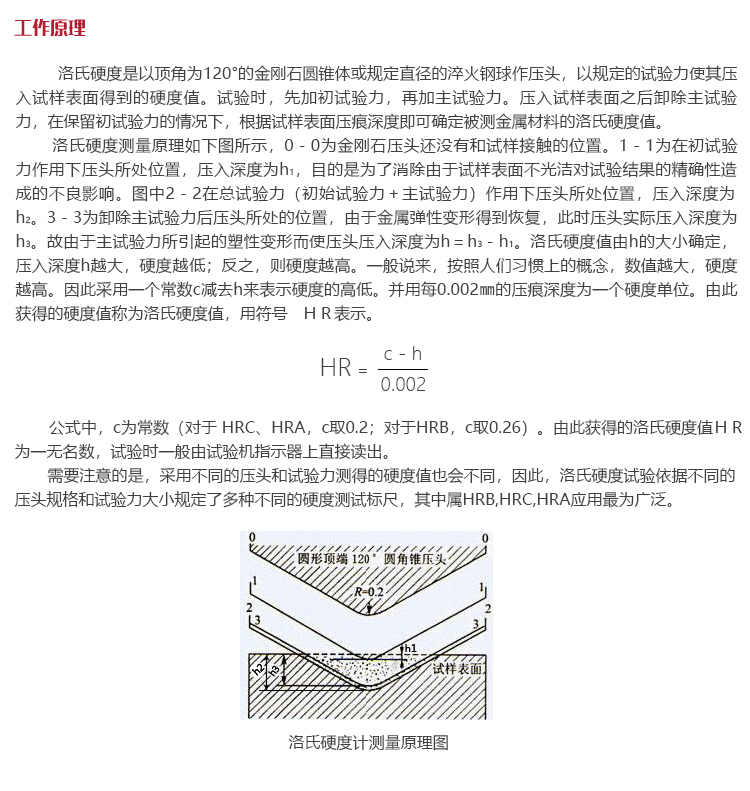 公式中,c為常數(shù)(對(duì)于 HRC、HRA,c取0.2;對(duì)于HRB,c取0.26)。由此獲得的洛氏硬度值HR為一無名數(shù),試驗(yàn)時(shí)一般由試驗(yàn)機(jī)指示器上直接讀出。