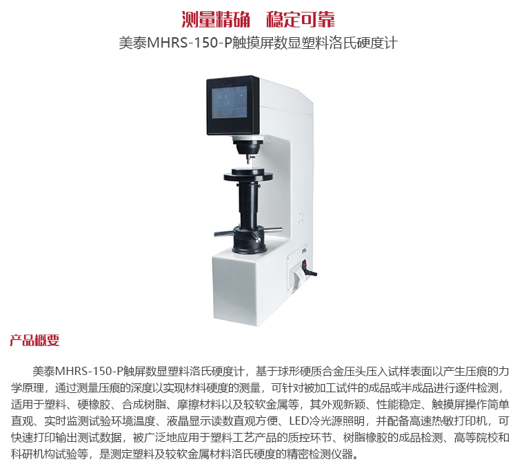 美泰MHRS-150-P觸屏數(shù)顯塑料洛氏硬度計(jì),基于球形硬質(zhì)合金壓頭壓入試樣表面以產(chǎn)生壓痕的力學(xué)原理,通過測(cè)量壓痕的深度以實(shí)現(xiàn)材料硬度的測(cè)量,可針對(duì)被加工試件的成品或半成品進(jìn)行逐件檢測(cè),適用于塑料、硬橡膠、合成樹脂、摩擦材料以及較軟金屬等,其外觀新穎、性能穩(wěn)定、觸摸屏操作簡(jiǎn)單直觀、實(shí)時(shí)監(jiān)測(cè)試驗(yàn)環(huán)境溫度、液晶顯示讀數(shù)直觀方便、LED冷光源照明,并配備高速熱敏打印機(jī),可快速打印輸出測(cè)試數(shù)據(jù),被廣泛地應(yīng)用于塑料工藝產(chǎn)品的質(zhì)控環(huán)節(jié)、樹脂橡膠的成品檢測(cè)、高等院校和科研機(jī)構(gòu)試驗(yàn)等,是測(cè)定塑料及較軟金屬材料洛氏硬度的精密檢測(cè)儀器。