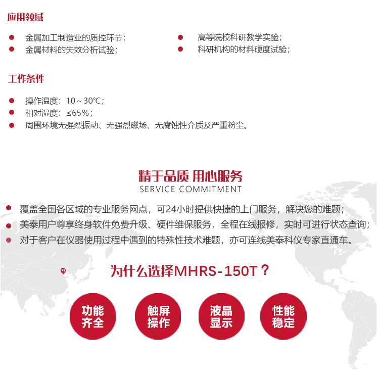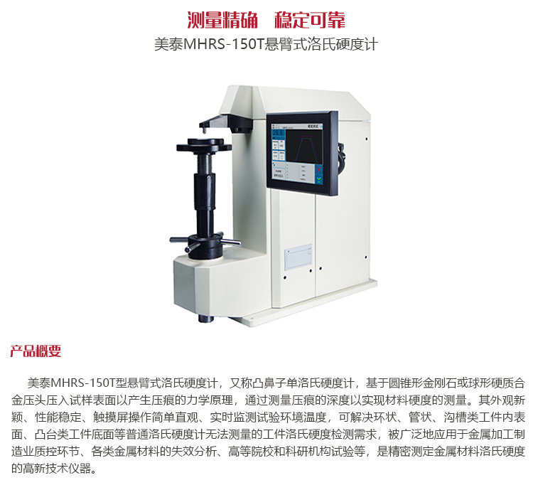 產(chǎn)品概述美泰MHRS-150T型懸臂式洛氏硬度計,又稱凸鼻子單洛氏硬度計,基于圓錐形金剛石或球形硬質(zhì)合金壓頭壓入試樣表面以產(chǎn)生壓痕的力學原理,通過測量壓痕的深度以實現(xiàn)材料硬度的測量。其外觀新穎、性能穩(wěn)定、觸摸屏操作簡單直觀、實時監(jiān)測試驗環(huán)境溫度,可解決環(huán)狀、管狀、溝槽類工件內(nèi)表面、凸臺類工件底面等普通洛氏硬度計無法測量的工件洛氏硬度檢測需求,被廣泛地應用于金屬加工制造業(yè)質(zhì)控環(huán)節(jié)、各類金屬材料的失效分析、高等院校和科研機構試驗等,是精密測定金屬材料洛氏硬度的高新技術儀器。