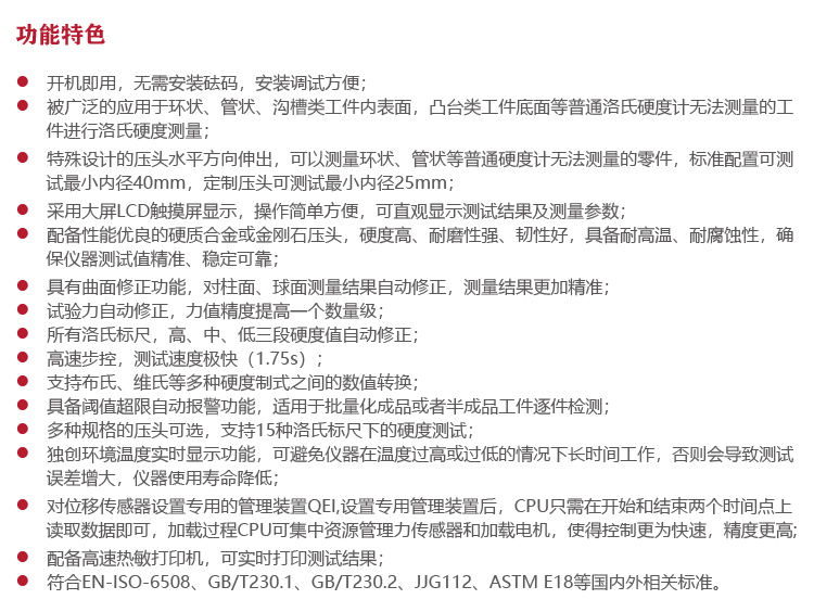 ?符合EN-ISO-6508、GB/T230.1、GB/T230.2、JJG112、ASTM E18等國內(nèi)外相關標準。