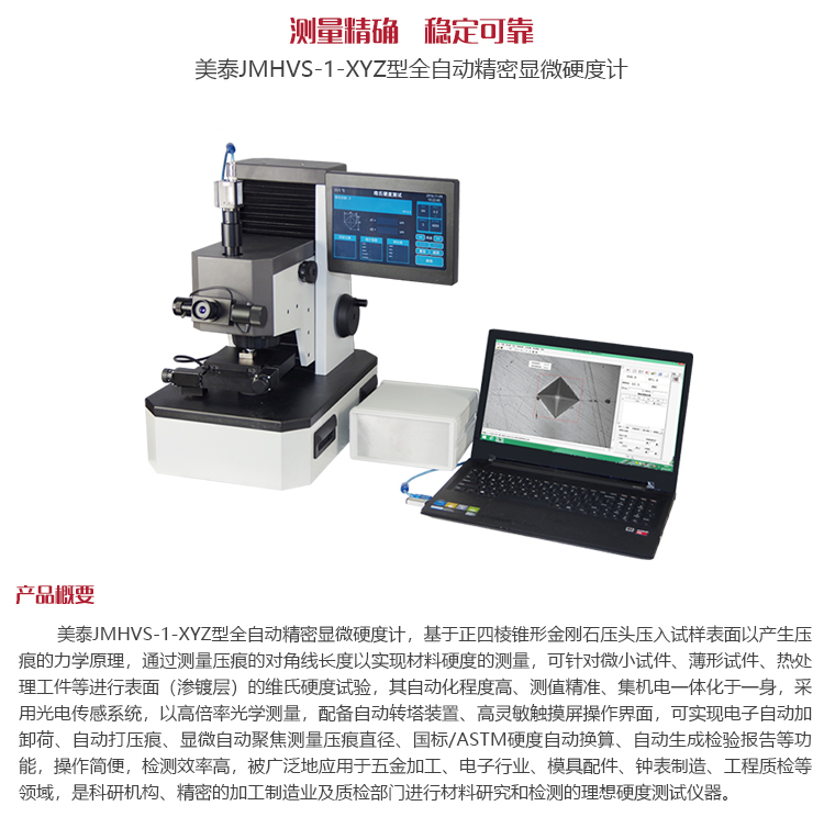 產(chǎn)品概述美泰JMHVS-1-XYZ型全自動(dòng)精密顯微硬度計(jì),基于正四棱錐形金剛石壓頭壓入試樣表面以產(chǎn)生壓痕的力學(xué)原理,通過測(cè)量壓痕的對(duì)角線長(zhǎng)度以實(shí)現(xiàn)材料硬度的測(cè)量,可針對(duì)微小試件、薄形試件、熱處理工件等進(jìn)行表面(滲鍍層)的維氏硬度試驗(yàn),其自動(dòng)化程度高、測(cè)值精準(zhǔn)、集機(jī)電一體化于一身,采用光電傳感系統(tǒng),以高倍率光學(xué)測(cè)量,配備自動(dòng)轉(zhuǎn)塔裝置、高靈敏觸摸屏操作界面、可實(shí)現(xiàn)電子自動(dòng)加卸荷、自動(dòng)打壓痕、顯微自動(dòng)聚焦測(cè)量壓痕直徑、國標(biāo)/ASTM硬度自動(dòng)換算、自動(dòng)生成檢驗(yàn)報(bào)告等功能,操作簡(jiǎn)便,檢測(cè)效率高,被廣泛地應(yīng)用于五金加工、電子行業(yè)、模具配件、鐘表制造、工程質(zhì)檢等領(lǐng)域,是科研機(jī)構(gòu)、精密的加工制造業(yè)及質(zhì)檢部門進(jìn)行材料研究和檢測(cè)的理想硬度測(cè)試儀器。