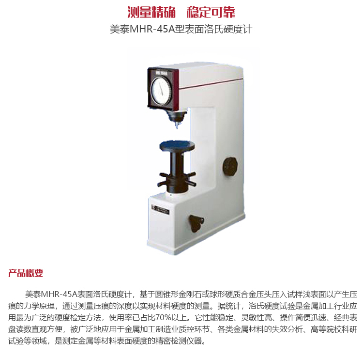 美泰MHR-45A表面洛氏硬度計(jì),基于圓錐形金剛石或球形硬質(zhì)合金壓頭壓入試樣淺表面以產(chǎn)生壓痕的力學(xué)原理,通過(guò)測(cè)量壓痕的深度以實(shí)現(xiàn)材料硬度的測(cè)量。據(jù)統(tǒng)計(jì),洛氏硬度試驗(yàn)是金屬加工行業(yè)應(yīng)用最為廣泛的硬度檢定方法,使用率已占比70%以上。它性能穩(wěn)定、靈敏性高、操作簡(jiǎn)便迅速、經(jīng)典表盤(pán)讀數(shù)直觀方便,被廣泛地應(yīng)用于金屬加工制造業(yè)質(zhì)控環(huán)節(jié)、各類金屬材料的失效分析、高等院??蒲性囼?yàn)等領(lǐng)域,是測(cè)定金屬等材料表面硬度的精密檢測(cè)儀器。