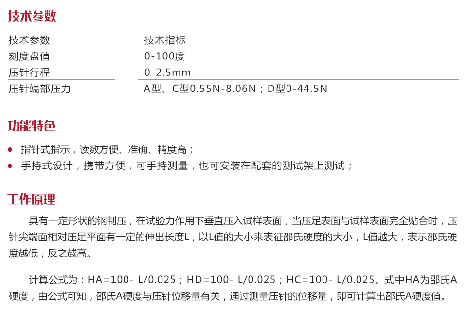 計(jì)算公式為: HA=100- L/0.025;HD=100- L/0.025;HC=100- L/0.025。式中HA為邵氏A硬度.由公式可知,邵氏A硬度與壓針位移量有關(guān).通過測(cè)量壓針的位移量,即可計(jì)算出邵氏A硬度值。