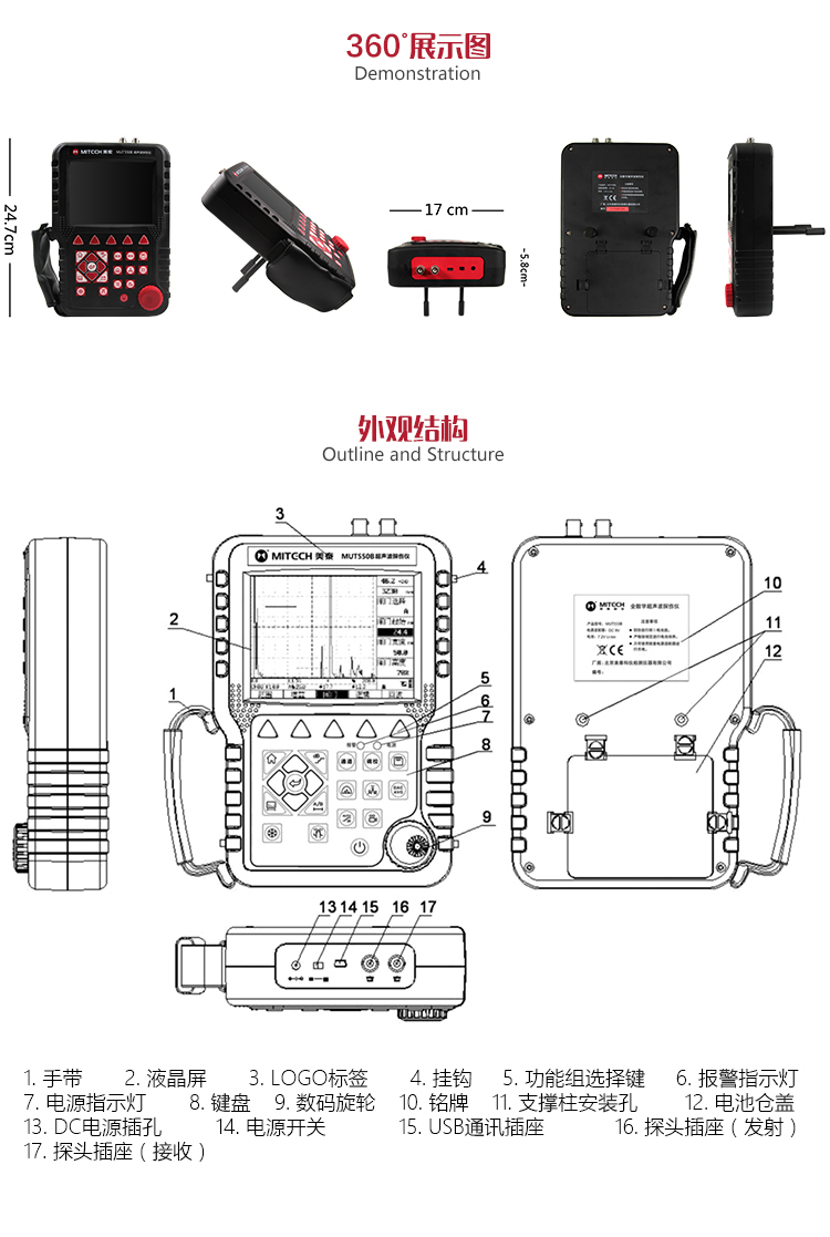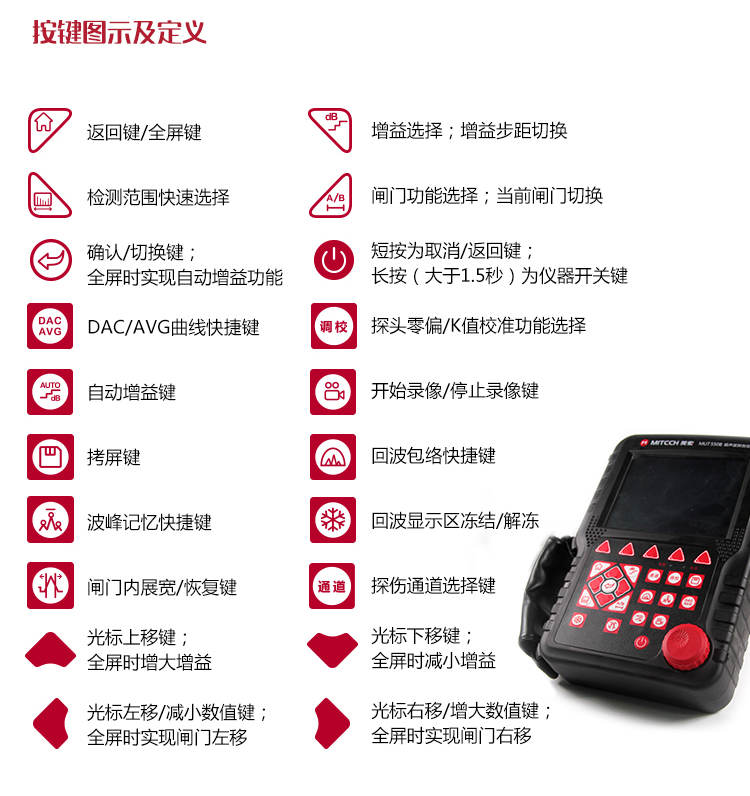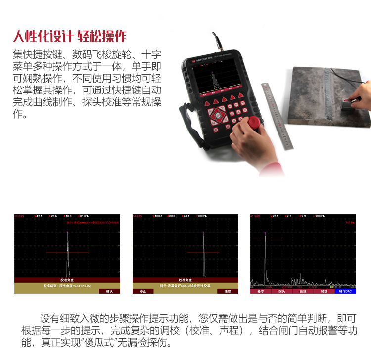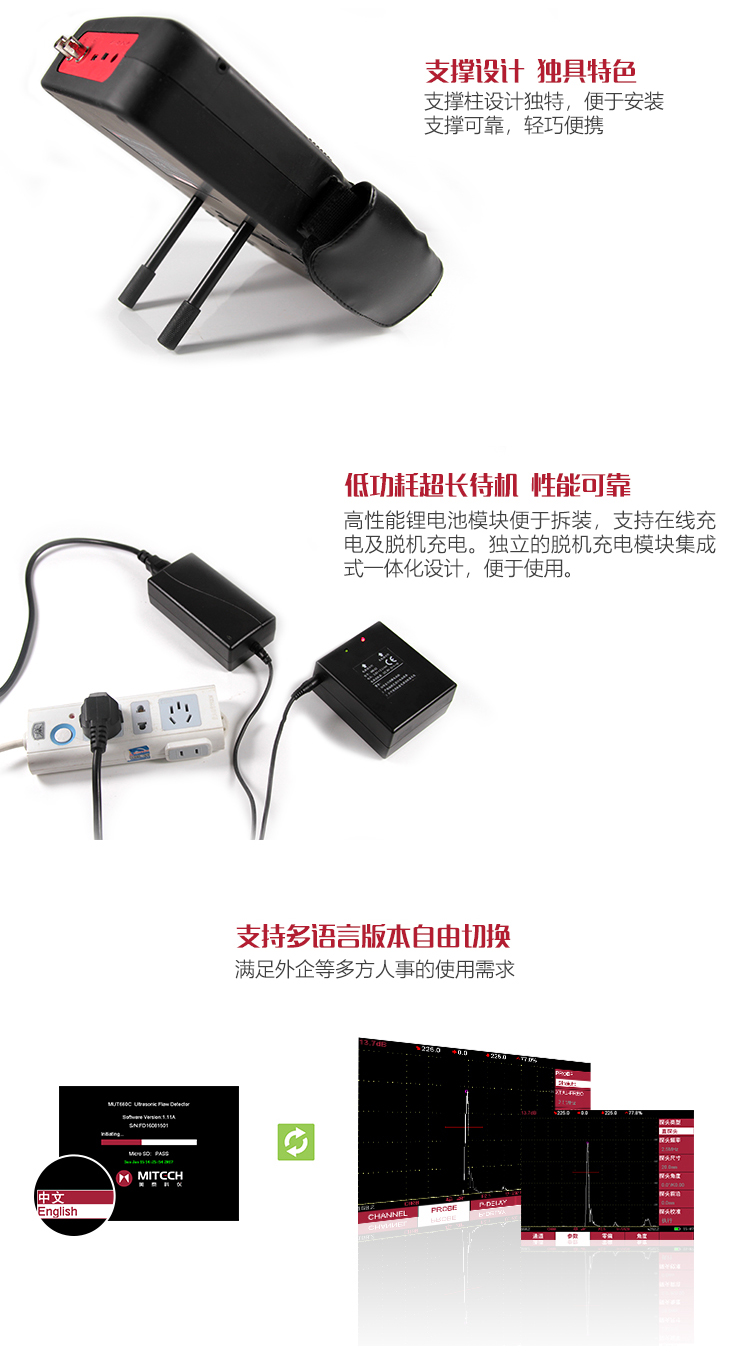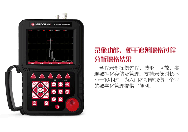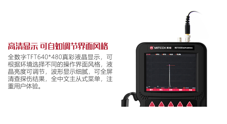產(chǎn)品概述MUT550B數(shù)字式超聲波探傷儀依據(jù)超聲傳播原理,可精準(zhǔn)、靈敏地進(jìn)行工件內(nèi)部多種缺陷(裂紋、夾雜、氣孔等)的檢測(cè)、定位、評(píng)估和診斷。采用全數(shù)字TFT640×480真彩色液晶顯示屏,在光線昏暗及日光強(qiáng)烈環(huán)境下都能為您呈現(xiàn)清晰缺陷;0-9999mm大量程可滿足制造業(yè)、鋼鐵冶金業(yè)、金屬加工業(yè)、化工業(yè)等常規(guī)的缺陷檢測(cè)需求;低功耗設(shè)計(jì)配備大容量高性能鋰離子電池模塊可連續(xù)工作10小時(shí)以上;全中文主從式菜單,注重用戶體驗(yàn),集快捷按鍵、數(shù)碼飛梭旋輪、十字菜單三種操作方式于一體,不同使用習(xí)慣均可操作自如;設(shè)有綜合性能指標(biāo)自檢功能,可自動(dòng)生成測(cè)試報(bào)告,支持多語(yǔ)言。該產(chǎn)品具有很高的性價(jià)比,是實(shí)用經(jīng)濟(jì)款超聲檢測(cè)儀器的明智之選。