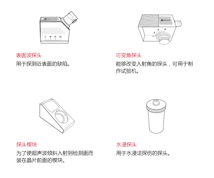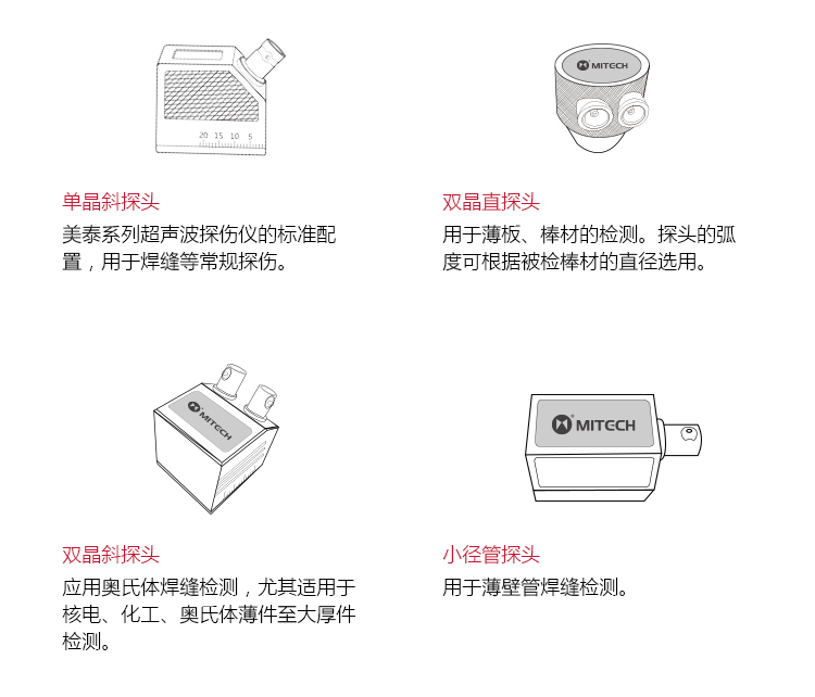 | 探頭類(lèi)型 | 直探頭、斜探頭、雙晶探頭、穿透探頭 |