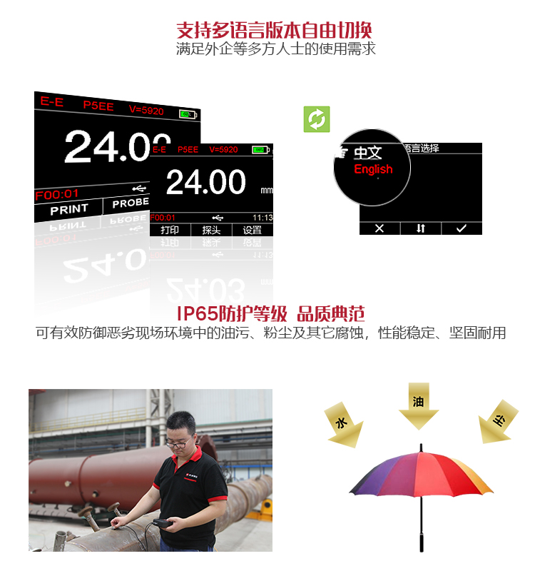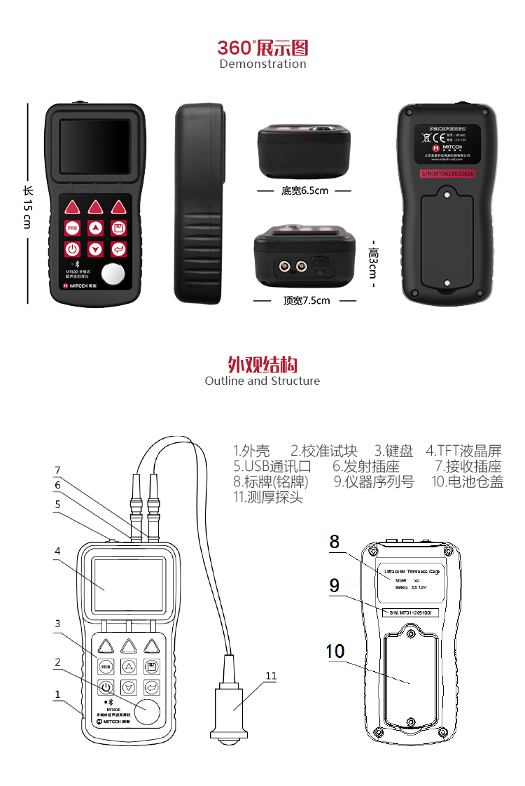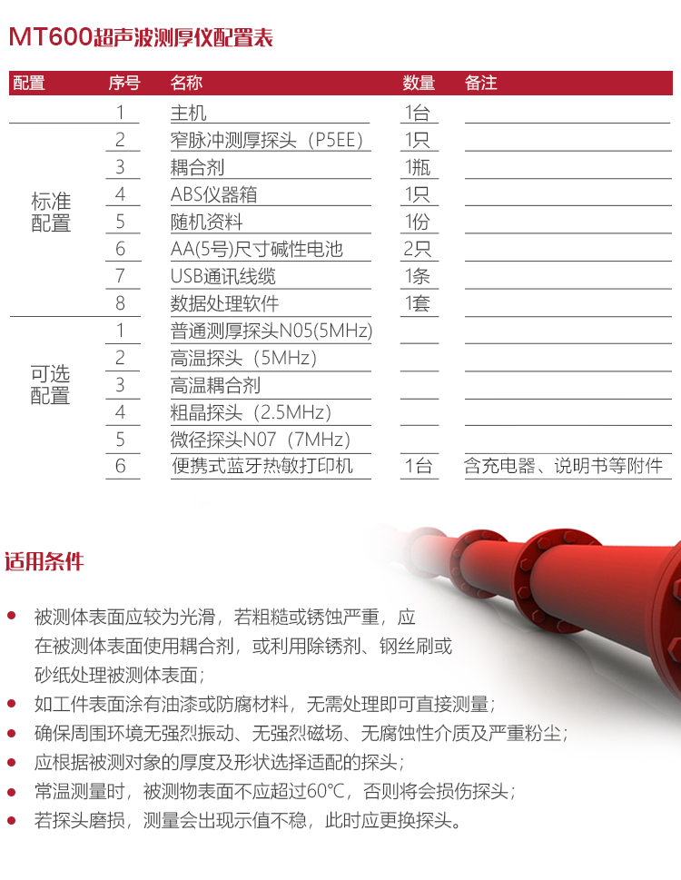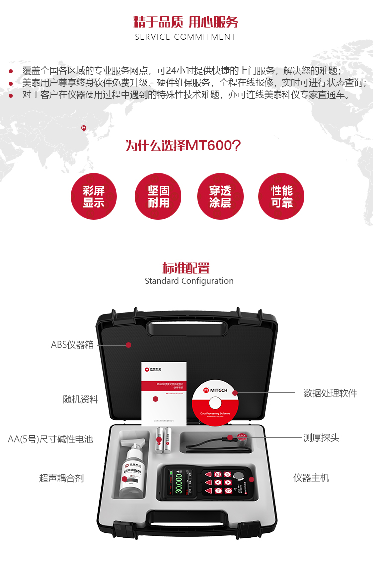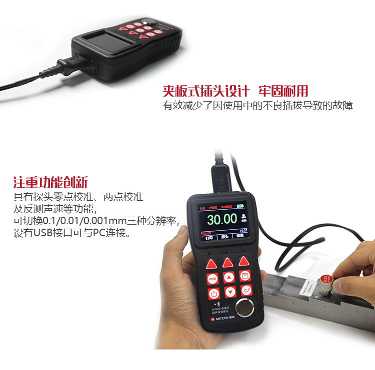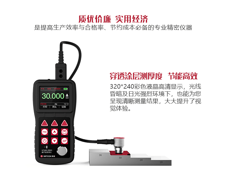 產(chǎn)品概述MT600超聲波測(cè)厚儀是美泰公司強(qiáng)力推出的升級(jí)產(chǎn)品,它更加注重用戶體驗(yàn)及功能創(chuàng)新,采用320×240彩色液晶顯示屏,光線昏暗及日光強(qiáng)烈環(huán)境下也能為您呈現(xiàn)清晰測(cè)量結(jié)果,大大提升了視覺(jué)體驗(yàn),IP65防護(hù)等級(jí),可有效防御惡劣現(xiàn)場(chǎng)環(huán)境中的油污、粉塵及其它腐蝕;創(chuàng)新設(shè)計(jì)的語(yǔ)言播報(bào)測(cè)量結(jié)果功能,可方便讀數(shù),超出設(shè)定范圍可自動(dòng)報(bào)警,滿足高效采集材料多點(diǎn)厚度的精準(zhǔn)檢測(cè)需求,支持0.001高精度顯示、藍(lán)牙通訊,兼?zhèn)浯┩竿繉幽J脚c普通模式雙效功能,其獨(dú)特的可穿透涂層測(cè)厚度的性能為表面涂有油漆或防腐材料的工件厚度檢測(cè)提供了更加高效的解決方案,測(cè)量前無(wú)需處理掉表面的涂層,可直接測(cè)量。被廣泛應(yīng)用于石油、化工、冶金、造船、航空、航天等領(lǐng)域的生產(chǎn)設(shè)備中各種管道及壓力容器腐蝕減薄程度的監(jiān)測(cè),也可用于對(duì)各種板材及各種加工零件做精確的測(cè)量。是提高生產(chǎn)效率與合格率、節(jié)約成本必備的專(zhuān)業(yè)精密儀器。