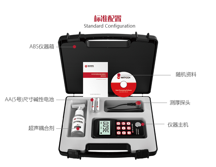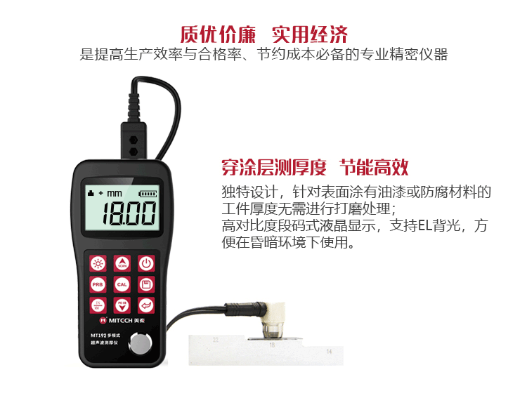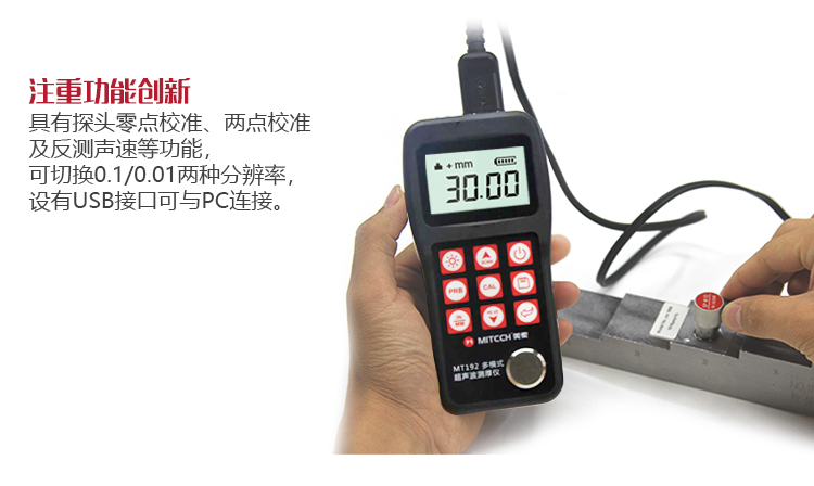 產(chǎn)品概述美泰MT192超聲波測厚儀,基于超聲波測量原理,可對金屬、塑料、陶瓷、玻璃及其他多種超聲波的良導體材料進行厚度測量,也可實現(xiàn)對材料聲速的反測。與傳統(tǒng)的測量方法相比,超聲波測厚儀的優(yōu)勢在于它只要接觸到被測工件的一面即可完成測量,其獨特的可穿透涂層測厚度的性能為表面涂有油漆或防腐材料的工件厚度檢測提供了更加高效的解決方案,測量前無需處理掉表面的涂層,可以直接測量。被廣泛應用于石油、化工、冶金、造船、航空、航天等領域的生產(chǎn)設備中各種管道及壓力容器腐蝕減薄程度的監(jiān)測,也可用于對各種板材及各種加工零件做精確的測量。是提高生產(chǎn)效率與合格率、節(jié)約成本必備的專業(yè)精密儀器。