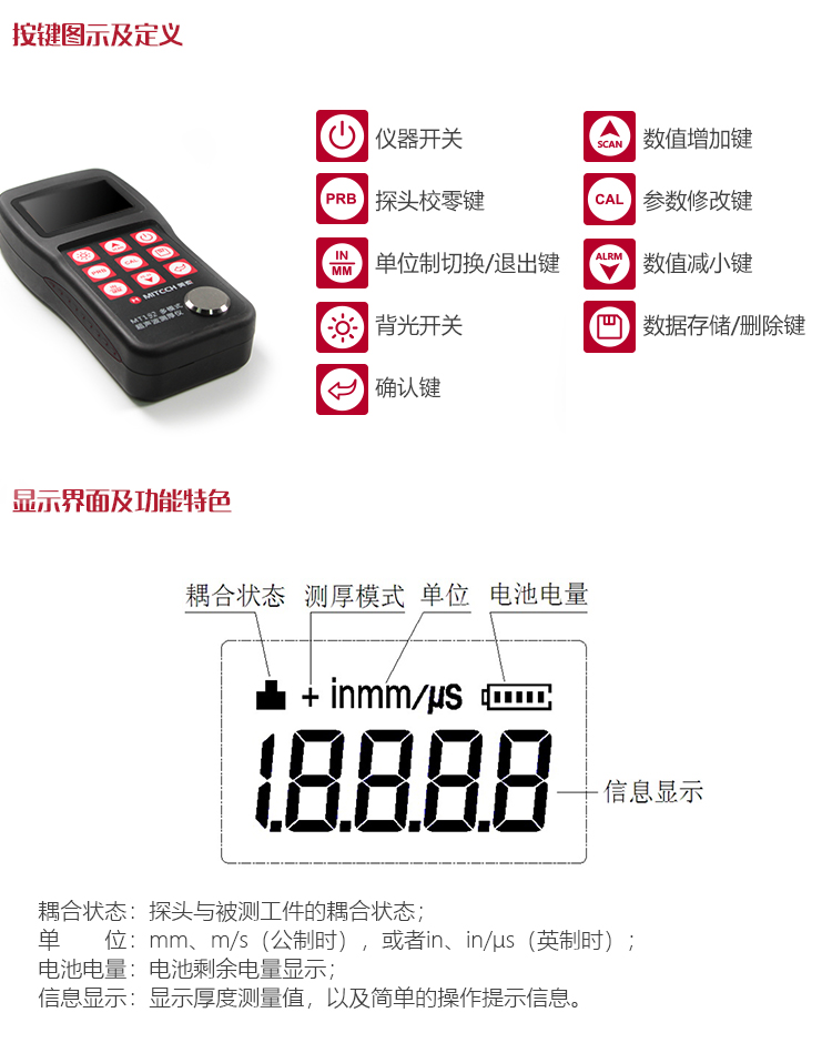 | 存儲 | 可存儲20組(每組最多100個測量值)厚度測量數(shù)據(jù) |