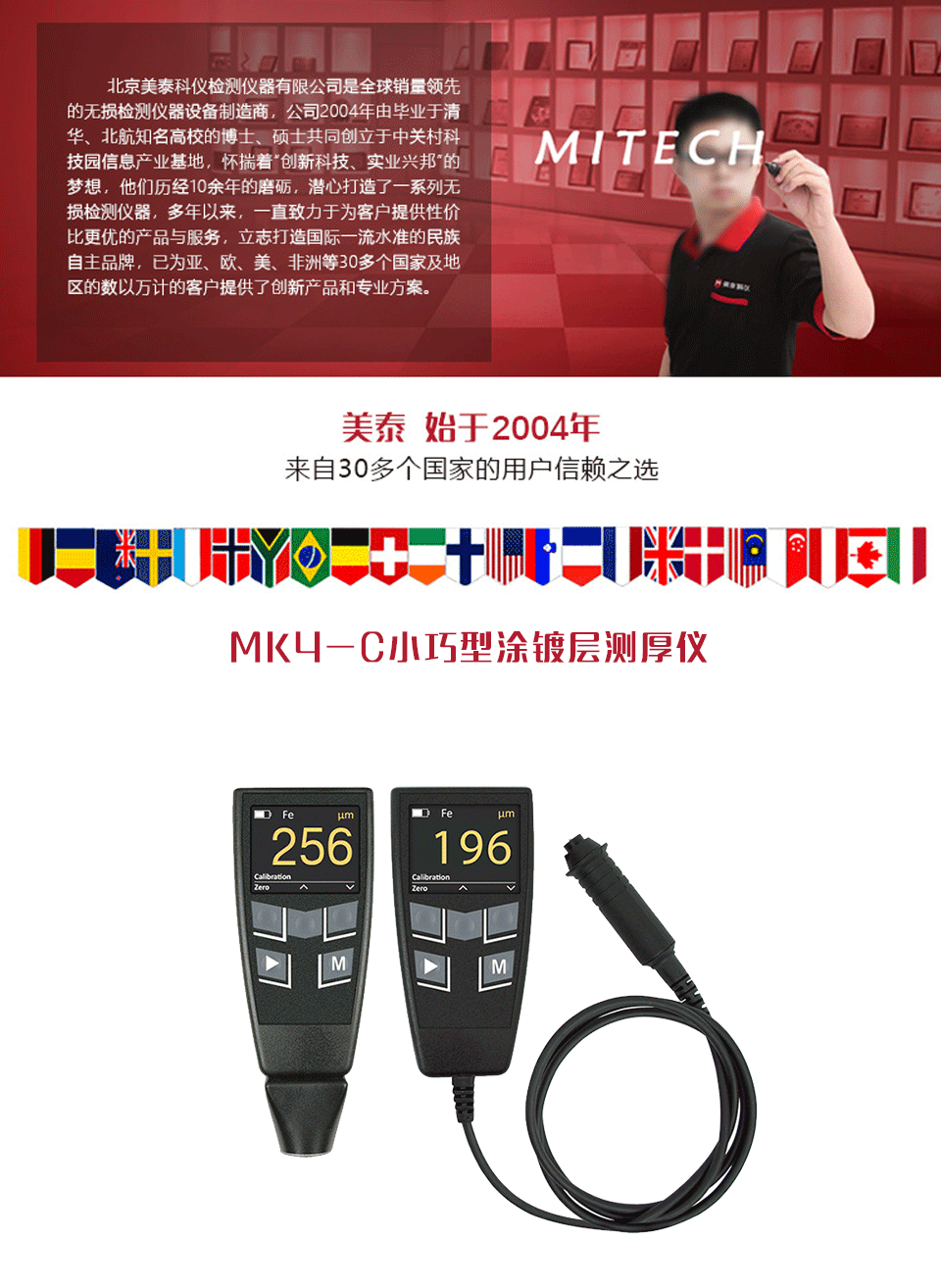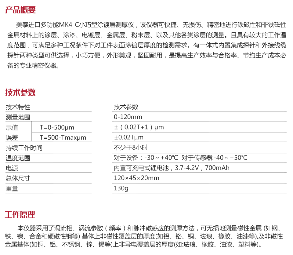 產(chǎn)品概述美泰進(jìn)口多功能MK4-C小巧型涂鍍層測(cè)厚儀,該儀器可快捷、無損傷、精密地進(jìn)行鐵磁性和非鐵磁性金屬材料上的涂層、涂漆、電鍍層、金屬層、粉末層、以及其他各類涂層的測(cè)量。且具有較大的工作溫度范圍,可滿足多種工況條件下對(duì)工件表面涂鍍層厚度的檢測(cè)需求。有一體式內(nèi)置集成探針和外接線纜探針兩種類型可供選擇,小巧方便,外形美觀,堅(jiān)固耐用,是提高生產(chǎn)效率與合格率、節(jié)約生產(chǎn)成本必備的專業(yè)精密儀器。
