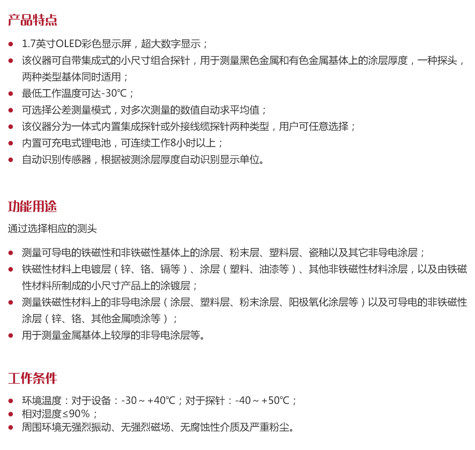 ?測(cè)量鐵磁性材料上的非導(dǎo)電涂層(涂層、塑料層、粉末涂層、陽極氧化涂層等)以及可導(dǎo)電的非鐵磁性涂層(鋅、鉻、其他金屬噴涂等);