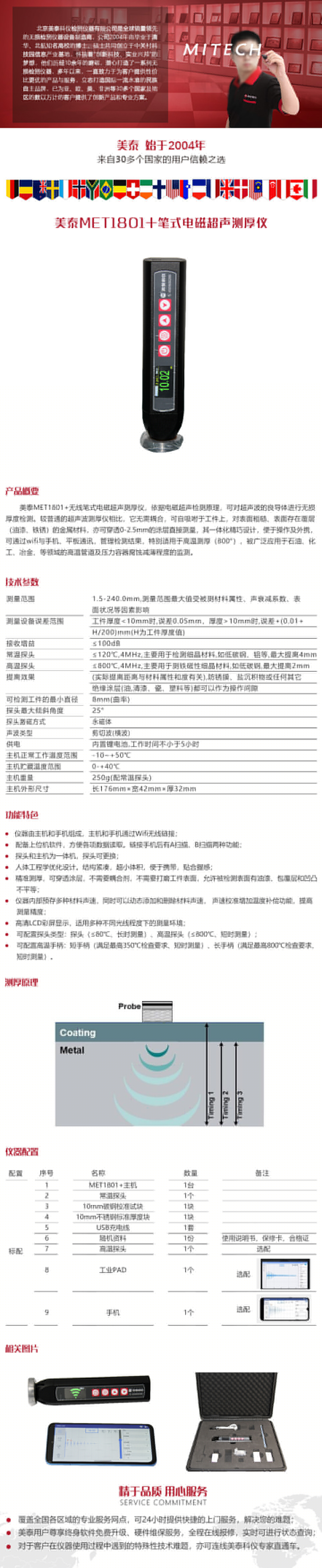 產(chǎn)品概述美泰MET1801+無(wú)線筆式電磁超聲測(cè)厚儀,依據(jù)電磁超聲檢測(cè)原理,可對(duì)超聲波的良導(dǎo)體進(jìn)行無(wú)損厚度檢測(cè)。較普通的超聲波測(cè)厚儀相比,它無(wú)需耦合,可自吸咐于工件上,對(duì)表面粗糙、表面存在覆層(油漆、鐵銹)的金屬材料,亦可穿透0-2.5mm的涂層直接測(cè)量,其一體化精巧設(shè)計(jì),便于操作及外攜,可通過(guò)wifi與手機(jī)、平板通訊,管理檢測(cè)結(jié)果,特別適用于高溫測(cè)厚(800°),被廣泛應(yīng)用于石油、化工、冶金、等領(lǐng)域的高溫管道及壓力容器腐蝕減薄程度的監(jiān)測(cè)。