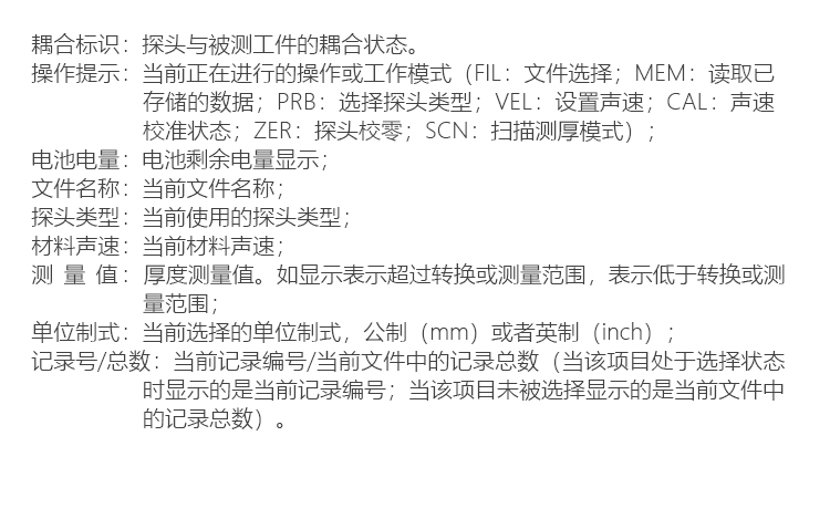 設(shè)置測(cè)厚模式:本儀器具有多模式測(cè)厚功能:發(fā)射-回波模式(P-E)和回波-回波(E-E)模式。回波-回波模式下,儀器顯示的測(cè)量值為自動(dòng)去除涂覆層后的厚度。檢測(cè)人員經(jīng)常要檢測(cè)帶涂層或者覆層的材料,例如管道和容器等。檢測(cè)前,這些涂覆層一般需要清除掉才能進(jìn)行測(cè)厚,否則就會(huì)導(dǎo)致較大的測(cè)量誤差。使用本儀器時(shí),如果選擇回波-回波模式并配以窄脈沖測(cè)厚探頭(型號(hào):P5EE),則可以不必清除涂覆層而直接進(jìn)行測(cè)厚。按鍵可以實(shí)現(xiàn)兩種測(cè)厚模式的切換。儀器顯示屏上,當(dāng)“+”圖標(biāo)出現(xiàn)時(shí),儀器工作于回波-回波模式;不顯示“+”圖標(biāo)時(shí),儀器工作于發(fā)射-回波模式。1) 按確定鍵在儀器內(nèi)置的聲速值之間切換;或者按向上鍵及向下鍵修改聲速值;2) 按CAL鍵結(jié)束儀器參數(shù)調(diào)整狀態(tài)。