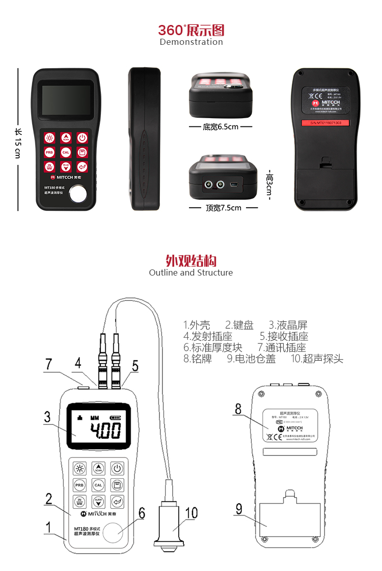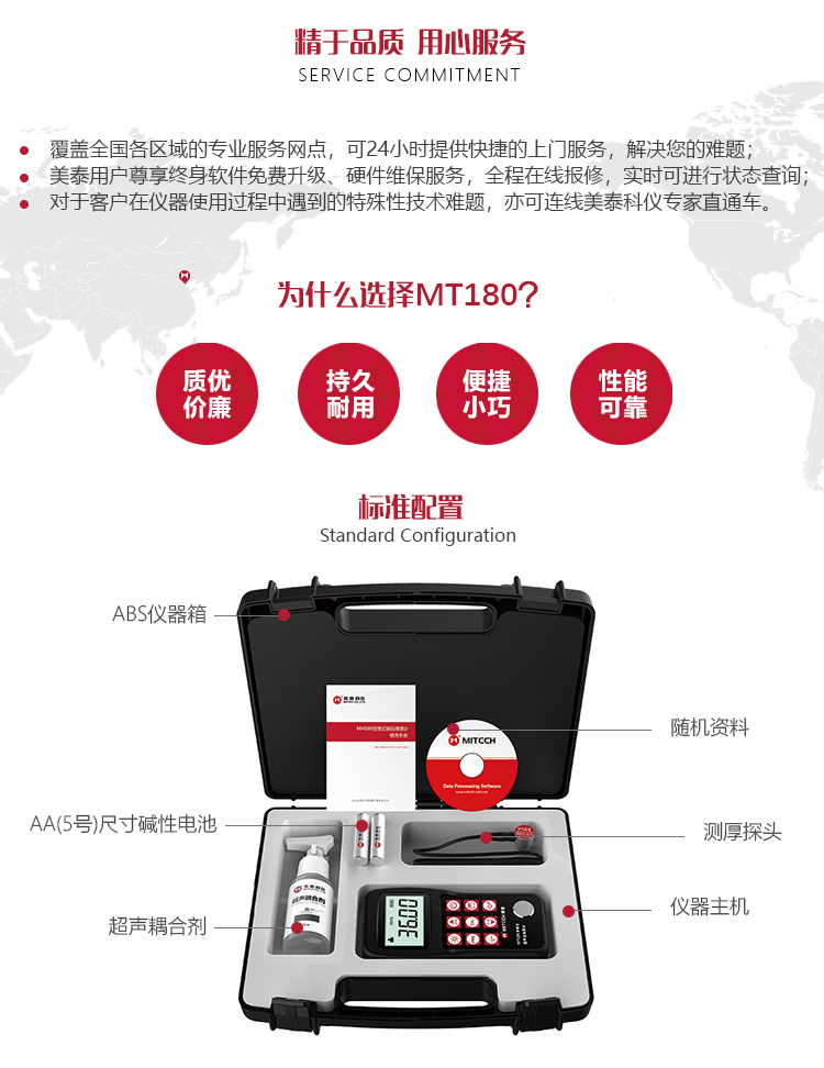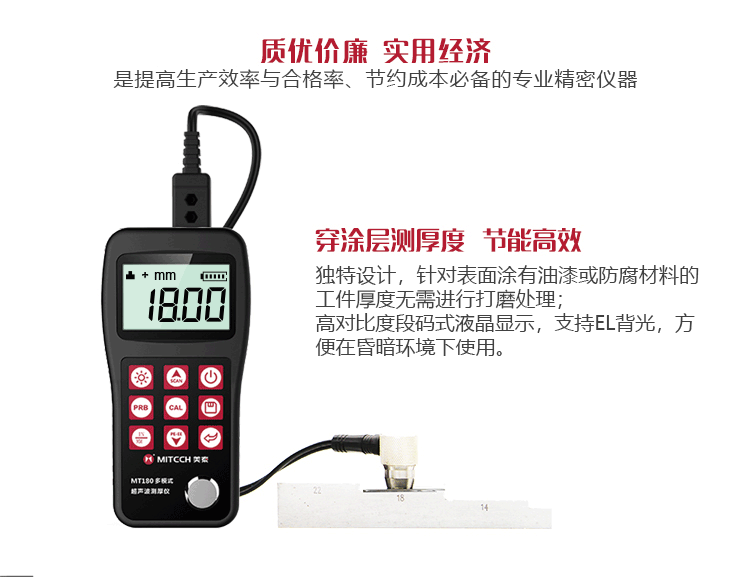 產(chǎn)品概述美泰MT180 超聲波測厚儀,基于超聲波測量原理,可對金屬、塑料、陶瓷、玻璃及其他多種超聲波的良導(dǎo)體材料進(jìn)行厚度測量,也可實現(xiàn)對材料聲速的反測。與傳統(tǒng)的測量方法相比,超聲波測厚儀的優(yōu)勢在于它只要接觸到被測工件的一面即可完成測量,其獨特的可穿透涂層測厚度的性能為表面涂有油漆或防腐材料的工件厚度檢測提供了更加高效的解決方案,測量前無需處理掉表面的涂層,直接亦可測量。被廣泛應(yīng)用于石油、化工、冶金、造船、航空、航天等領(lǐng)域的生產(chǎn)設(shè)備中各種管道及壓力容器腐蝕減薄程度的監(jiān)測,也可用于對各種板材及各種加工零件做精確的測量。是提高生產(chǎn)效率與合格率、節(jié)約成本必備的專業(yè)精密儀器。