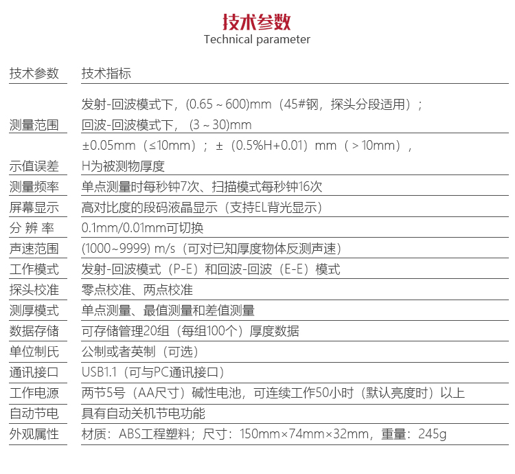 | 存儲 | 可存儲20組(每組最多100個測量值)厚度測量數(shù)據(jù) |