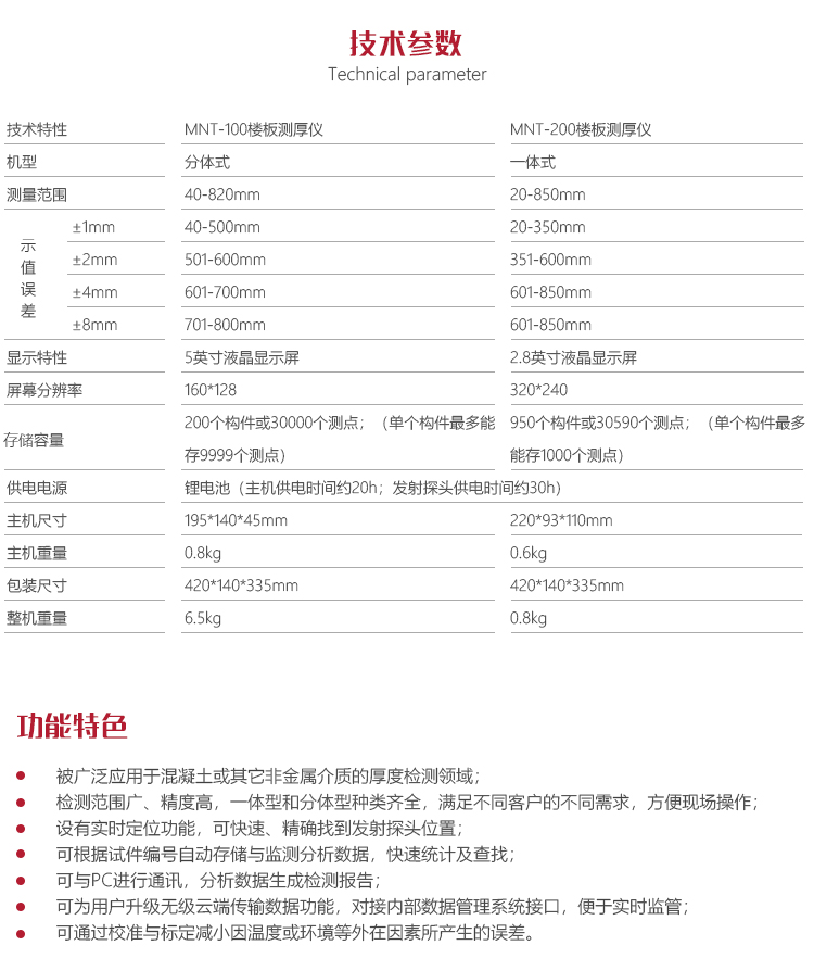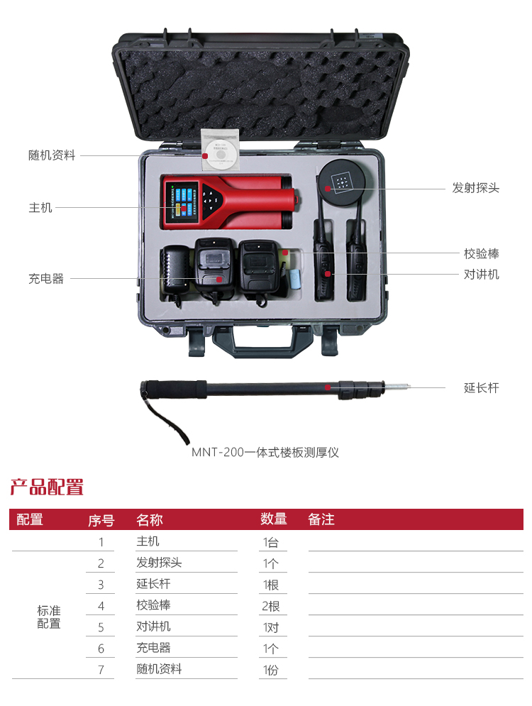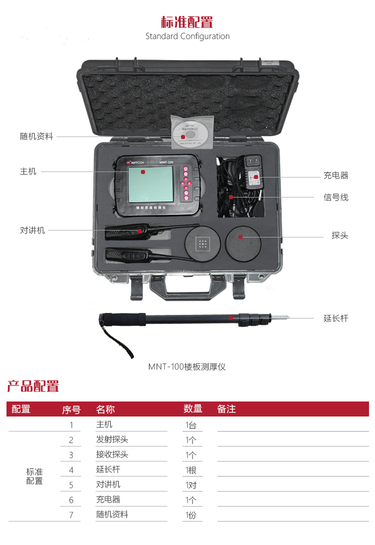 產(chǎn)品概述美泰MNT-200一體化樓板測厚儀,基于電磁波幅值衰減的原理,可有效對混凝土等非鐵磁體介質(zhì)進行無損厚度測量。其體積小、重量輕,一體化設(shè)計集成度更高,故障率低。使用時,通過主機屏幕上的箭頭指示來確定主機移動方向,對準發(fā)射探頭時,儀器會智能判讀樓板厚度。其測值速度快、測量精度高、性能穩(wěn)定可靠,被廣泛應(yīng)用于建筑施工質(zhì)量監(jiān)控檢測等領(lǐng)域,是保障生命財產(chǎn)安全必備的專業(yè)精密檢測儀器。