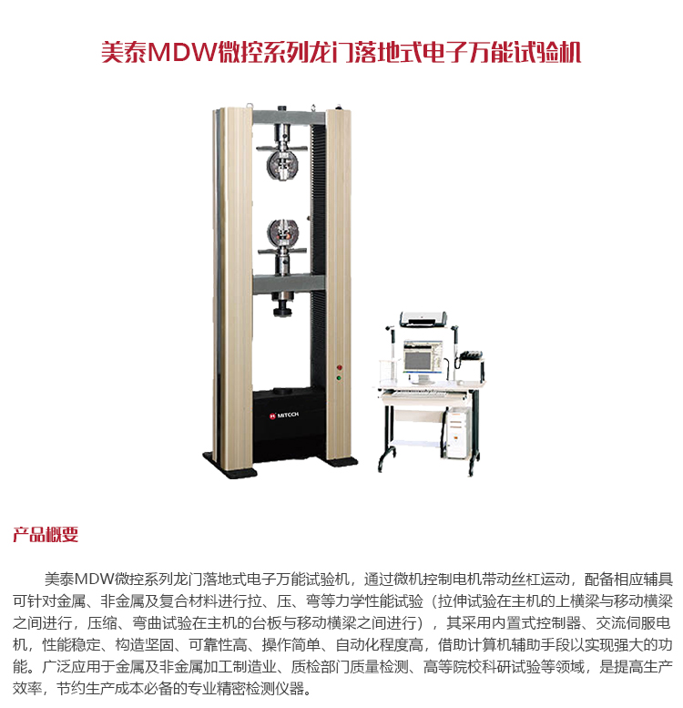 產(chǎn)品概述美泰MDW微控系列龍門落地式電子萬能試驗機,通過微機控制電機帶動絲杠運動,配備相應輔具可針對金屬、非金屬及復合材料進行拉、壓、彎等力學性能試驗(拉伸試驗在主機的上橫梁與移動橫梁之間進行,壓縮、彎曲試驗在主機的臺板與移動橫梁之間進行),其采用內(nèi)置式控制器、交流伺服電機,性能穩(wěn)定、構造堅固、可靠性高、操作簡單、自動化程度高,借助計算機輔助手段以實現(xiàn)強大的功能。廣泛應用于金屬及非金屬加工制造業(yè)、質(zhì)檢部門質(zhì)量檢測、高等院??蒲性囼灥阮I域,是提高生產(chǎn)效率,節(jié)約生產(chǎn)成本必備的專業(yè)精密檢測儀器。