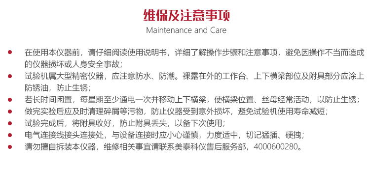試驗機屬大型精密儀器,應注意防水、防潮。裸露在外的工作臺、上下橫梁部位及附具部分應涂上防銹油,防止生銹;