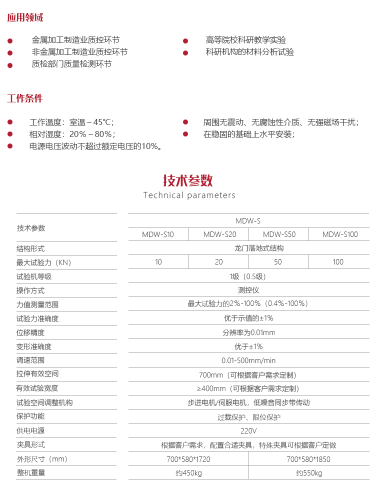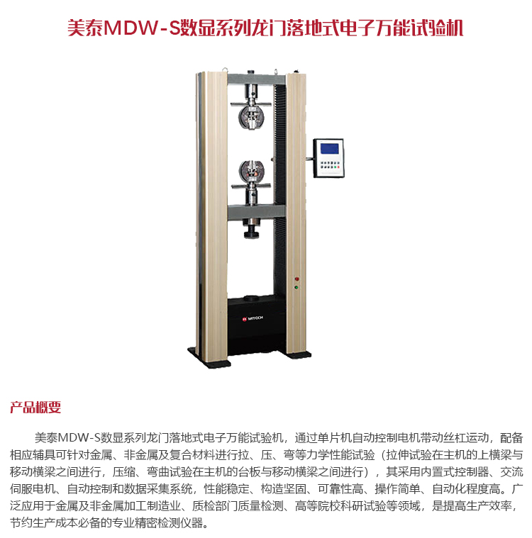 產(chǎn)品概述美泰MDW-S數(shù)顯系列龍門落地式電子萬(wàn)能試驗(yàn)機(jī),通過單片機(jī)自動(dòng)控制電機(jī)帶動(dòng)絲杠運(yùn)動(dòng),配備相應(yīng)輔具可針對(duì)金屬、非金屬及復(fù)合材料進(jìn)行拉、壓、彎等力學(xué)性能試驗(yàn)(拉伸試驗(yàn)在主機(jī)的上橫梁與移動(dòng)橫梁之間進(jìn)行,壓縮、彎曲試驗(yàn)在主機(jī)的臺(tái)板與移動(dòng)橫梁之間進(jìn)行),其采用內(nèi)置式控制器、交流伺服電機(jī)、自動(dòng)控制和數(shù)據(jù)采集系統(tǒng),性能穩(wěn)定、構(gòu)造堅(jiān)固、可靠性高、操作簡(jiǎn)單、自動(dòng)化程度高。廣泛應(yīng)用于金屬及非金屬加工制造業(yè)、質(zhì)檢部門質(zhì)量檢測(cè)、高等院??蒲性囼?yàn)等領(lǐng)域,是提高生產(chǎn)效率,節(jié)約生產(chǎn)成本必備的專業(yè)精密檢測(cè)儀器。