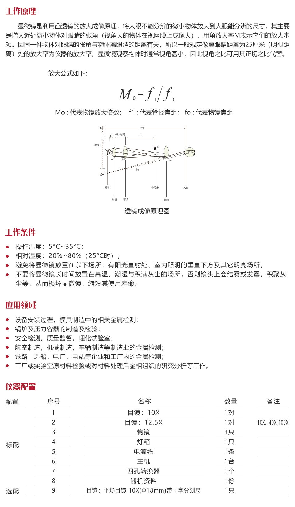 工作原理顯微鏡是利用凸透鏡的放大成像原理,將人眼不能分辨的微小物體放大到人眼能分辨的尺寸,其主要是增大近處微小物體對(duì)眼睛的張角(視角大的物體在視網(wǎng)膜上成像大),用角放大率M表示它們的放大本領(lǐng)。因同一件物體對(duì)眼睛的張角與物體離眼睛的距離有關(guān),所以一般規(guī)定像離眼睛距離為25厘米(明視距離)處的放大率為儀器的放大率。顯微鏡觀察物體時(shí)通常視角甚小,因此視角之比可用其正切之比代替。