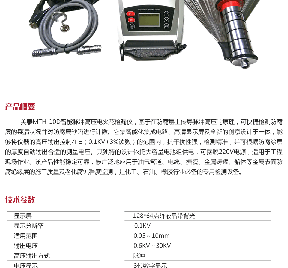 產(chǎn)品概述MTH-10D型數(shù)字式直流電火花檢漏儀,基于將脈沖高壓傳導(dǎo)通過(guò)防腐層的原理,可快捷檢測(cè)防腐層的裂漏狀況,使用中,針對(duì)防腐層的質(zhì)量問(wèn)題,如遇針孔、氣泡、裂紋,儀器會(huì)發(fā)出明亮的電火花,同時(shí)伴有警示音,操作極為簡(jiǎn)便,其獨(dú)特的設(shè)計(jì)依托大容量電池組供電,可擺脫220V電源,適用于工程現(xiàn)場(chǎng)作業(yè)。該產(chǎn)品性能穩(wěn)定可靠,被廣泛地應(yīng)用于油氣管道、電纜、搪瓷、金屬鑄罐、船體等金屬表面防腐絕緣層的施工質(zhì)量及老化腐蝕程度監(jiān)測(cè),是化工、石油、橡膠行業(yè)必備的專用檢測(cè)設(shè)備。