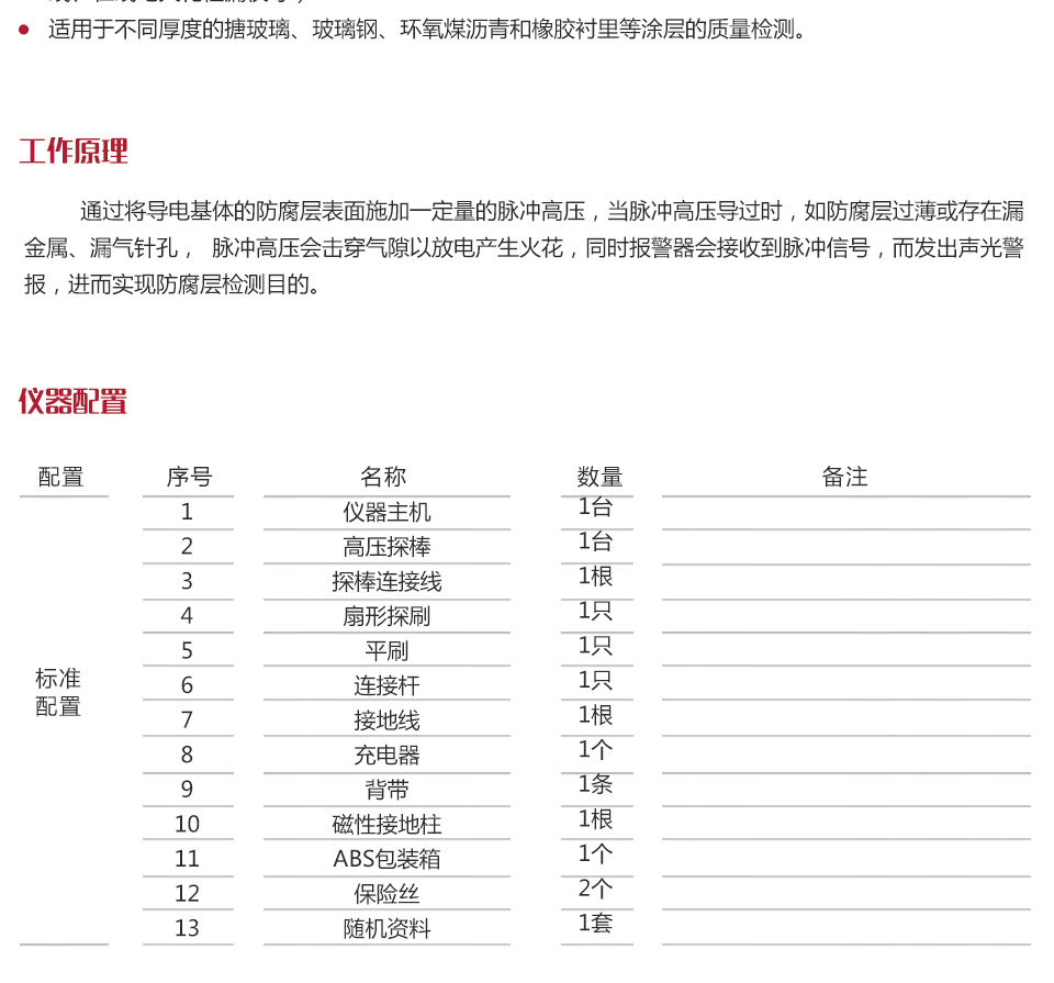 功能用途?適用于不同厚度的搪玻璃、玻璃鋼、環(huán)氧煤瀝青和橡膠襯里等涂層的質(zhì)量檢測(cè)。