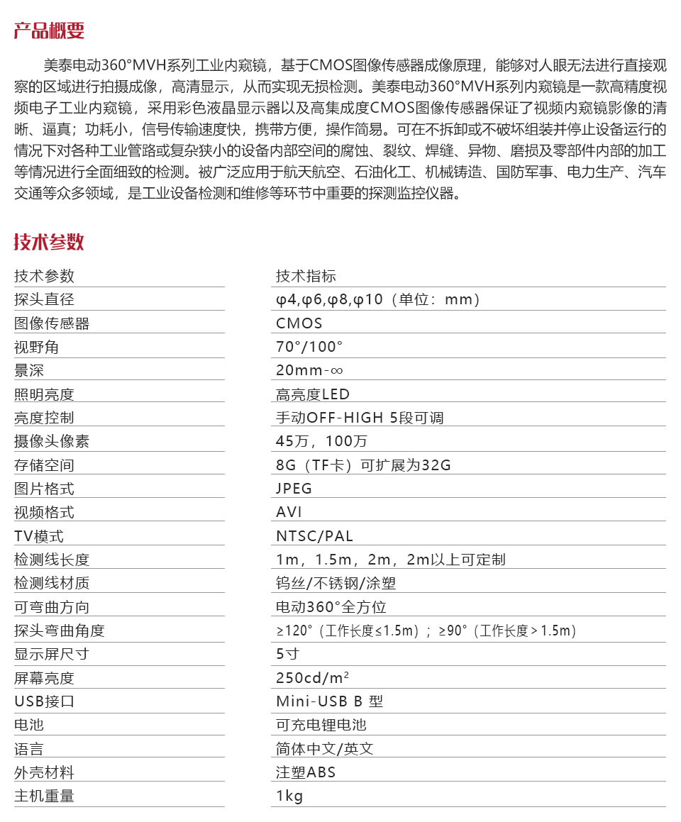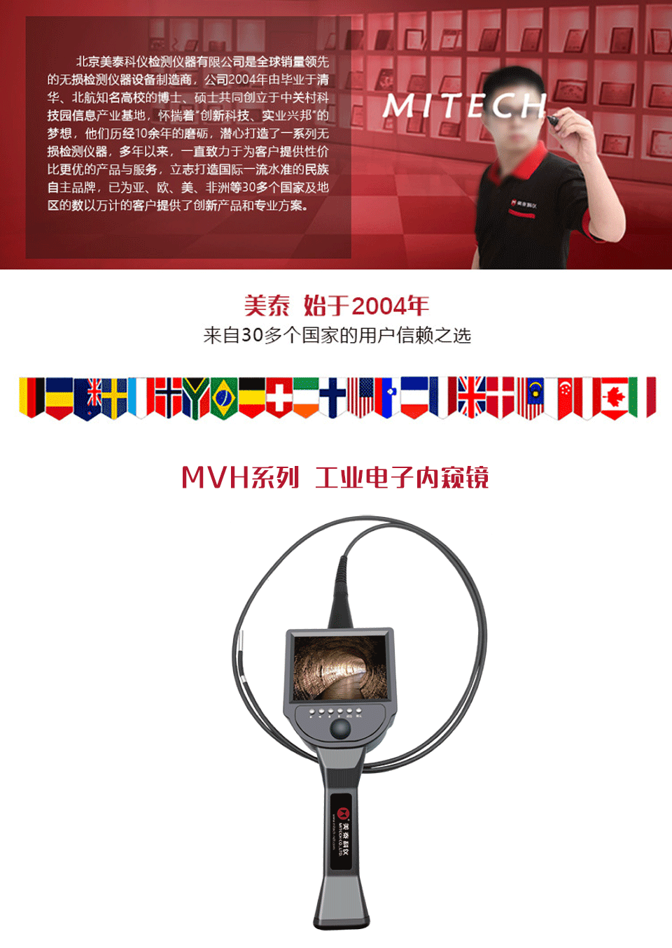 美泰電動360°MVH系列工業(yè)內(nèi)窺鏡,基于CMOS圖像傳感器成像原理,能夠?qū)θ搜蹮o法進行直接觀察的區(qū)域進行拍攝成像,高清顯示,從而實現(xiàn)無損檢測。美泰電動360°MVH系列內(nèi)窺鏡是一款高精度視頻電子工業(yè)內(nèi)窺鏡,采用彩色液晶顯示器以及高集成度CMOS圖像傳感器保證了視頻內(nèi)窺鏡影像的清晰、逼真;功耗小,信號傳輸速度快,攜帶方便,操作簡易??稍?/span>不拆卸或不破壞組裝并停止設(shè)備運行的情況下對各種工業(yè)管路或復(fù)雜狹小的設(shè)備內(nèi)部空間的腐蝕、裂紋、焊縫、異物、磨損及零部件內(nèi)部的加工等情況進行全面細(xì)致的檢測。被廣泛應(yīng)用于航天航空、石油化工、機械鑄造、國防軍事、電力生產(chǎn)、汽車交通等眾多領(lǐng)域,是工業(yè)設(shè)備檢測和維修等環(huán)節(jié)中重要的探測監(jiān)控儀器。